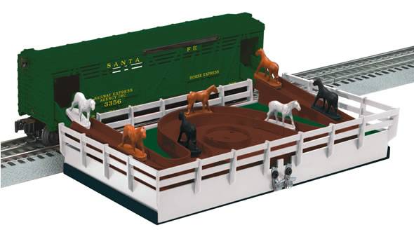 #3356 Santa Fe Horse Car with Corral None Action SKU: 6-19895 Dimensions: Length: 11 1/8" Gauge: Traditional O Gauge price: 149.99 year: 2004 rail line: Santa Fe Minimum Radius: O-27 Catalog Year: 2004 Catalog Title: Classic Trains Vol. 1 2004 Road Number: None Operating Livestock Car - 5/04 FEATURES: Die-cast metal trucks and operating couplers Horses move around corral and through the car Includes corral and seven horse figures Postwar Celebration Series plaque and packaging Manuals Find the latest manuals in our support section. Replacement Parts Buy any replacement parts in our support section. Contact Contact a service station to fix your product