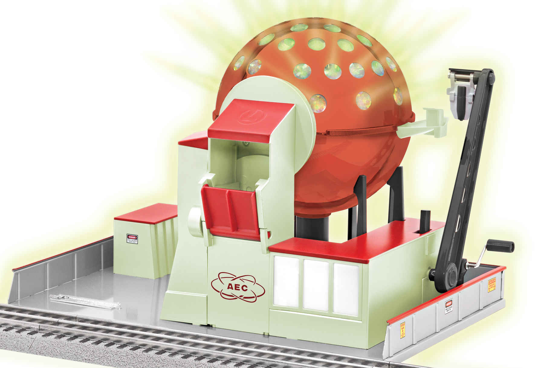 AEC Nuclear Reactor Originally inspired by a background illustration in the 1958 Lionel catalog, the Nuclear Reactor is the perfect accessory to add to your AEC Radioactive Transport Set! A magnetized arm unloads metal pellet loads from a waiting car. (1) Once raised, the metal pellets are dropped and loaded into the reactor dome. (2) Once activated, the nuclear reactor bursts in reactor light and the metal load is seemingly “processed” within the nuclear reactor. (3) Glow-in-the-dark “isotopic” material can then be released from the nuclear dome, and exited down a chute into an awaiting freight car. (4) Action Lighting SKU: 6-24294 Dimensions: 15” x 12” x 8 1/2” Gauge: Traditional O Gauge price: 299.99 year: 0 rail line: AEC Minimum Radius: None Catalog Year: 2010 Catalog Title: Lionel Signature Edition Volume One 2010 Road Number: None AEC Nuclear Reactor Die-cast crane arm Stamped metal base and upper dome Single can motor Detailed molded lower domet Remote or manual operation Interior sequential lighting Interior strobing LED Includes one bag of steel pellets Includes one bag of glow-in-the-dark "isotope" material New AEC decoration Manuals Find the latest manuals in our support section. Replacement Parts Buy any replacement parts in our support section. Contact Contact a service station to fix your product