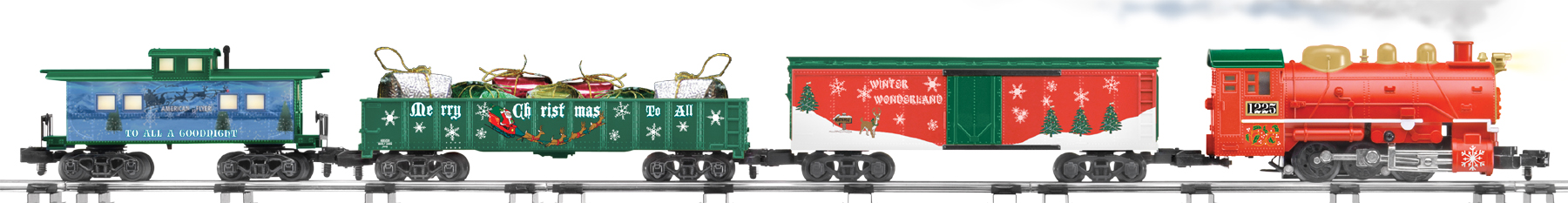 American Flyer Ready-to-Run Christmas Set (LOCO #1225) Santa will be happy to see this elaborately decorated set led by a red 0-6-0 steam Locomotive. The set also includes a gondola with a generous load of presents, a refrigerator car that plays twelve holiday songs, and a "To all a Goodnight" caboose with lighted interior illumination. A complete loop of American Flyer track and a 40-watt transformer complete this American Flyer Ready-to-Run Christmas Set. Lighting Smoke Unit Sounds SKU: 6-49621 Dimensions: Locomotive Length: 7 1/2"Set Length: Approx. 32" Gauge: American Flyer/S Gauge price: 349.99 year: 0 rail line: None Minimum Radius: None Catalog Year: 2009 Catalog Title: Lionel 2009 Volume II Road Number: None AF Ready-to-run Christmas Set AF Christmas Set Music Refrigerator Car Addendum Locomotive Features: Transformer controlled forward, neutral, and reverse operation Powerful maintenance-free motor with momentum flywheel Directional lighting, including operating headlight and back-up light Front and rear operating couplers Traction tires Puffing smoke unit Rolling Stock Features: Die-cast metal trucks Metal frame on reefer and caboose Musical reefer plays 12 holiday songs (9 volt battery not included) Gondola includes assortment of removable presents Interior illumination in caboose Manuals Find the latest manuals in our support section. Replacement Parts Buy any replacement parts in our support section. Contact Contact a service station to fix your product