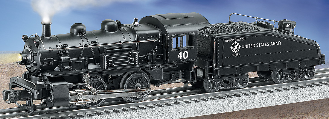 Army Transportation Corps 0-4-0 Steam Locomotive #40 These die-cast metal switchers are ready for action on any layout. Push or pull rolling stock with dual operating couplers. Each locomotive also includes an all-new realistic steam whistle. Lighting Smoke Unit Sounds SKU: 6-28679 Dimensions: None Gauge: Traditional O Gauge price: 169.99 year: 2006 rail line: U.S. Army Minimum Radius: O-27 Catalog Year: 2006 Catalog Title: Classic Trains Vol. 1 2006 Road Number: 40 0-4-0 Steam Switcher - 4/08 ADDITIONAL FEATURES: Transformer controlled forward, neutral, and reverse operation Electronic steam whistle Powerful, maintenance-free motor Die-cast metal locomotive body and frame Traction tires Puffing smoke unit Die-cast metal tender trucks Die-cast metal tender frame Directional lighting, including operating headlight and back-up light Front and rear operating couplers TRADITIONAL STEAM LOCOMOTIVE FEATURES: Operating whistles, headlights, and couplers Realistic smoke Minimum Curve: O-27 Affordable additions to Lionel train sets Perfectly matched to Lionel Traditional Rolling Stock Manuals Find the latest manuals in our support section. Replacement Parts Buy any replacement parts in our support section. Contact Contact a service station to fix your product