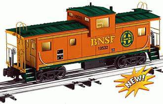 BNSF Extended Vision Caboose With a new Extended Vision Caboose behind your favorite Lionel locomotive and rolling stock, your consist will be rich in features and separately applied detail from head to tail! An Extended Vision Caboose gives the conductor the best of both worlds—the height of a cupola and the width of a bay window. He can see above and around the larger freight cars from his seat in the widened cupola. ---From top to bottom, each caboose is inspired by the real thing. Notice the bright liveries and sharply molded exteriors. The special white cupola of the Santa Fe caboose signified its role in run-through service between Kansas City and Elkhart, Indiana on Conrail. Employees of the Union Pacific authored the safety slogans that appeared on the sides of that railroad's cabooses. This level of detail and accuracy exists on the inside of each car as well. Remove the cupola, or peer through a window, and you will find a new fully detailed, illuminated interior. See your authorized Lionel dealer today and ask to see the all-new Lionel Extended Vision Cabooses Lighting Smoke Unit SKU: 6-17628 Dimensions: Length 10 1/8" Gauge: Standard O Scale price: 79.95 year: 0 rail line: BNSF Minimum Radius: O-27 Catalog Year: 2001 Catalog Title: Classic Trains Vol. 2 2001 Road Number: None Body Molded Plastic Body Couplers Magnetic Couplers Lighting Interior Lighting Miscellaneous Smoke Unit Metal Handrails Opening Doors Trucks Die-cast metal sprung trucks Manuals Find the latest manuals in our support section. Replacement Parts Buy any replacement parts in our support section. Contact Contact a service station to fix your product