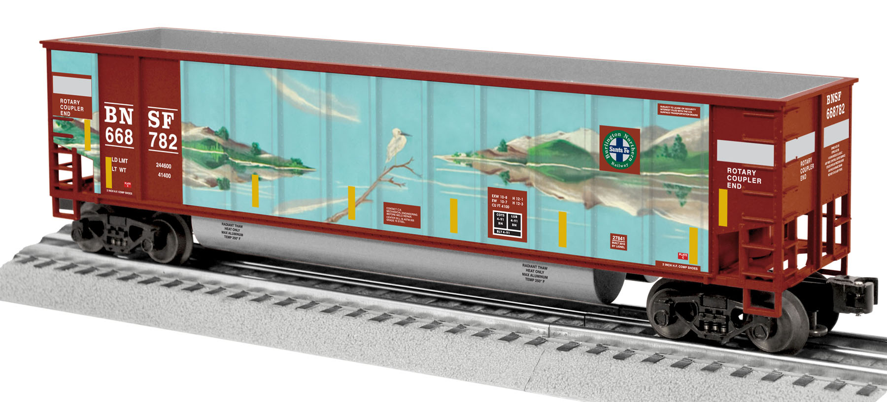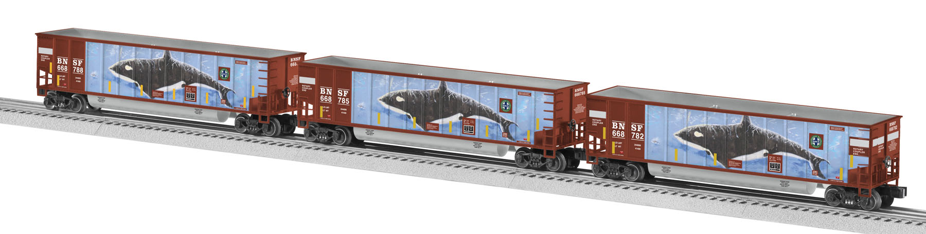 BNSF Whale-Scene Rotary Bathtub Gondola 3-Pack True to the actual gondola on the BNSF rail line, Lionel offers modern BNSF “whale-scheme” decoration on three new Lionel bathtub gondolas. Featuring unique decoration on each side of the car, these bathtub gondolas also come equipped with rotary couplers. SKU: 6-27844 Dimensions: Length: 11 ¾” per car Gauge: Standard O Scale price: 199.99 year: 0 rail line: BNSF Minimum Radius: O-31 Catalog Year: 2010 Catalog Title: Lionel Signature Edition Volume One 2010 Road Number: None Die-cast metal trucks and operating couplers One dual rotary coupler car and two with single rotary coupler Unique road number on each car Manuals Find the latest manuals in our support section. Replacement Parts Buy any replacement parts in our support section. Contact Contact a service station to fix your product