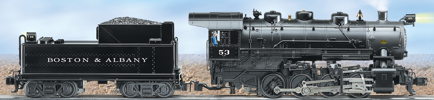 Boston & Albany TMCC USRA 0-8-0 Steam Switcher #53 The USRA 0-8-0 performed switching duties and hauled short branchline trains on rails in every part of the country. With an 0-31 minimum curve, the Lionel Boston & Albany 0-8-0 provides an affordable way to bring a scale-sized, super-detailed, fully-featured steam locomotive to virtually any O gauge layout. This tough yard goat is better than ever with a host of high performance enhancements and even more added-on detail. ElectroCouplers Lighting Odyssey System RailSounds Smoke Unit TrainMaster Command Control Wireless Tether SKU: 6-28702 Dimensions: Length: 18 1/4" Gauge: Standard O Scale price: 649.99 year: 2005 rail line: Boston & Albany Minimum Radius: O-31 Catalog Year: 2005 Catalog Title: Classic Trains Vol. 1 2005 Road Number: 53 FEATURES: <b>UPGRADED</b> Odyssey System for speed control with ON/OFF switch <b>UPGRADED</b> Refined Conventional Transformer Control Mode with lower starting speeds, improved smoke output and simplified Odyssey system controls <b>UPGRADED</b> Synchronized fan-driven smoke unit with improved smoke output <b>NEW</b> Opening roof hatches <b>NEW</b> Realistic, separately applied coal load TrainMaster Command Control equipped—able to run in Command Control Mode or in Conventional Transformer Control Mode Powerful maintenance-free motor with momentum flywheel Wireless Tether connection between locomotive and tender Directional lighting including operating headlight and back-up light on rear of tender Die-cast metal locomotive body, frame, trucks and pilot Front and rear ElectroCouplers Traction tires Separately applied metal details Accurate separately applied builder's plates Illuminated cab interior including painted valve handles Glowing firebox in cab Cab window glass Engineer and fireman figures Die-cast metal tender body and trucks Opening tender water hatch reveals easy-to-access RailSounds controls UPGRADED to the RailSounds 5.0 sound system including: New intelligible CrewTalk dialog and more TowerCom announcements, each with different scenarios depending on whether the locomotive is in motion or stopped Realistic operator-controlled effects such as the water injector activated by the CAB-1 Remote Controller MultiWhistle effect simulates blows at different steam pressures, long and short attacks, and even extra quilling with each whistle blow DynaChuff synchronized chuffing that shifts, automatically via locomotive speed or manually via the CAB-1 Remote Controller, among 15 levels of intensity to simulate a locomotive running light or battling against a heavy load Four chuffs per wheel revolution Independently adjustable volume control—lower the level of background effects such as chuffing with the CAB-1 Remote Controller while keeping operator-controlled effects such as the whistle and crew announcements at full volume Many operator-controlled effects including CrewTalk dialog and TowerCom announcements are accessible in Conventional Transformer Control Mode Manuals Find the latest manuals in our support section. Replacement Parts Buy any replacement parts in our support section. Contact Contact a service station to fix your product
