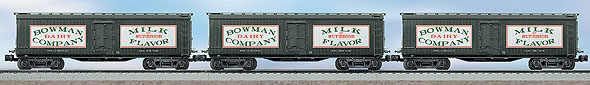 Bowman Dairy General American Milk Car 3-Pack None SKU: 6-21856 Dimensions: <p class=msonormal style="margin: 0in 0in 0pt">Length: Single car 11 1/2"</p> Gauge: Standard O Scale price: 149.99 year: 2006 rail line: Bowman Dairy Minimum Radius: O-31 Catalog Year: 2006 Catalog Title: Classic Trains Vol. 2 2006 Road Number: None ADDITIONAL FEATURES: Hidden uncoupling tabs Die-cast metal sprung buffers Separately applied metal underframe details Removable roof Plated interior milk tanks and piping Opening doors Single and 3-Pack milk cars available in unique, sequential numbers STANDARD O FREIGHT CARS Die-cast metal sprung trucks for improved tracking, especially through switches Operating couplers—uncouple cars automatically with a remote-control or uncoupling track section Scale proportions Super-detailed with many separately applied metal parts Prototypical paint schemes Minimum Curve: O-31 (Except where noted) Perfectly sized to match Lionel Standard O Locomotives Manuals Find the latest manuals in our support section. Replacement Parts Buy any replacement parts in our support section. Contact Contact a service station to fix your product