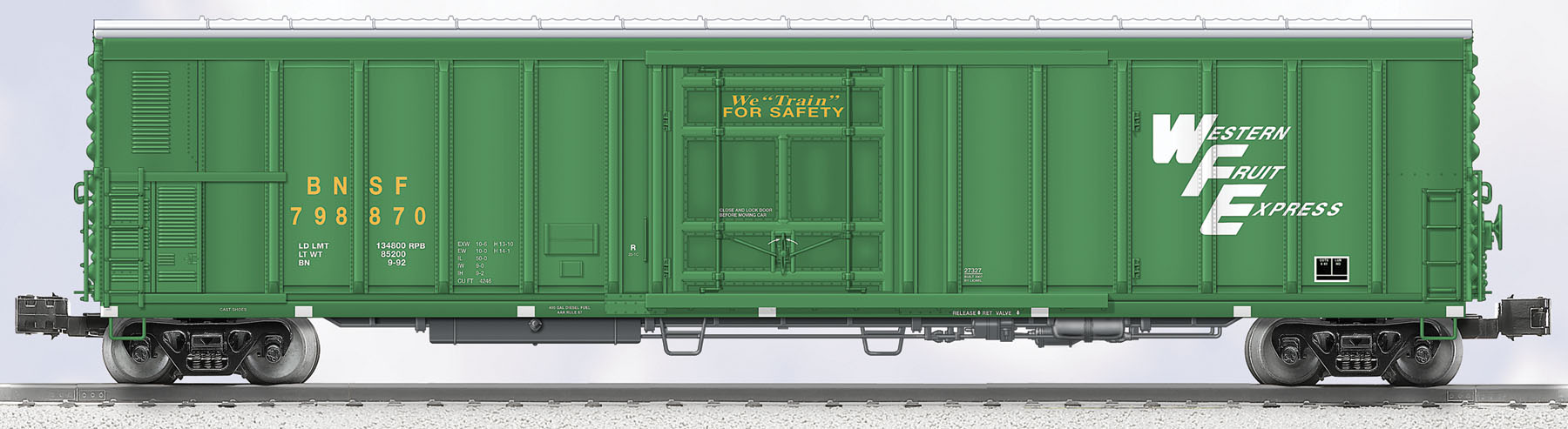 Burlington Northern Santa Fe 57' Mechanical Refrigerator Car #798870 Mechanical Refrigerator Cars By the 1960's, railroads' aging ice reefers were being rapidly replaced by vast fleets of efficient Mechanical Refrigerator Cars. As manufacturers like Pacific Car & Foundry and Western Fruit Express developed more efficient ways to keep perishables fridge-fresh when transported by rail, these modern, diesel-powered cars became a common and colorful site on America's rails. Lionel is proud to include these Mechanical Refrigerator Cars with its growing fleet of realistic Standard O freight cars. Based on actual drawings from the mid-1960's, these cars are designed with brake equipment positioned low on the ends, short ladders, and no running board on the modern roof. Slide open the vented mechanical compartment door to inspect the diesel engine on the inside of the car. SKU: 6-27327 Dimensions: Length: 14 1/4" Gauge: Standard O Scale price: 69.99 year: 2007 rail line: BNSF Minimum Radius: O-31 Catalog Year: 2007 Catalog Title: Lionel 2007 Train Catalog Volume 2 Road Number: 798870 FEATURES: Die-cast metal sprung trucks and operating couplers Hidden uncoupling tabs Rotating bearing caps Separately applied metal underframe details Opening doors Sliding compartment door reveals diesel engine Single and 2-Pack cars are available in unique, sequential road numbers Manuals Find the latest manuals in our support section. Replacement Parts Buy any replacement parts in our support section. Contact Contact a service station to fix your product