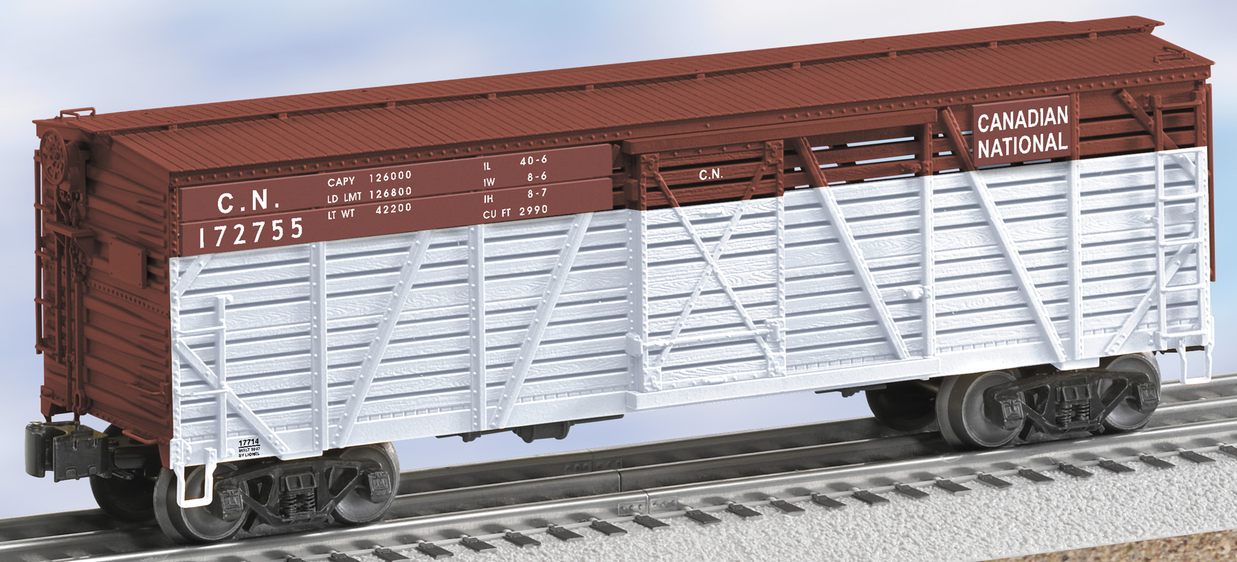 Canadian National ACF 40-Ton Stock Car #172755 None SKU: 6-17714 Dimensions: Length: 11 1/2" Gauge: Standard O Scale price: 59.99 year: 2007 rail line: Canadian National Minimum Radius: O-31 Catalog Year: 2006 Catalog Title: Classic Trains Vol. 2 2006 Road Number: 172755 ADDITIONAL FEATURES: Hidden uncoupling tabs Die-cast metal frame Metal underframe details Opening doors STANDARD O ROLLING STOCK: Die-cast metal sprung trucks for improved tracking, especially through switches Operating couplers—uncouple cars automatically with a remote-control or uncoupling track section Scale proportions Super-detailed with many separately-applied metal parts Prototypical paint schemes Minimum Curve: O-31 (Except where noted) Perfectly sized to match Lionel Standard O Locomotives Manuals Find the latest manuals in our support section. Replacement Parts Buy any replacement parts in our support section. Contact Contact a service station to fix your product
