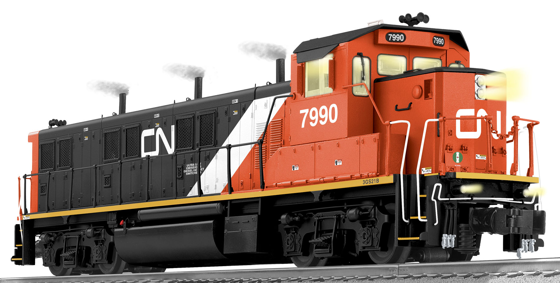Canadian National LEGACY Genset Switcher #7990 Built by the National Railway Equipment Company, the clean and efficient Genset switcher sets the standard for environmental friendliness on the modern rails. Four separate 700-h.p. generator sets (or Gen-sets) power this unique locomotive, each marked on the exterior by its own exhaust stack. The Lionel model is a 1:48 scale engine with a die-cast metal body and frame and a variety of high detail and features, including a removable cab roof, three operating exhaust stacks, LEGACY Control, and LEGACY RailSounds. ElectroCouplers LEGACY Control System Lighting Smoke Unit Odyssey System II LEGACY RailSounds SKU: 6-28384 Dimensions: Length: 16” Gauge: Standard O Scale price: 799.99 year: 2011 rail line: Canadian National Minimum Radius: O-42/O-54 Recommended Catalog Year: 2012 Catalog Title: Lionel 2012 Volume 2 Road Number: 7990 LEGACY 3GS21B Genset Diesel Manual 11/11 LEGACY 3GS21B Genset Product Video 11/11 <b>LEGACY Control System</b> equipped – able to run in LEGACY Control mode, in TrainMaster Command Control mode, or in Conventional mode with a standard transformer <b>Odyssey II Speed Control</b> with On/Off switch <b>LEGACY RailSounds</b> sound system featuring: - CrewTalk dialog and TowerCom announcements, each with different scenarios depending on whether the locomotive is in motion or stopped- Six official railroad speeds with CrewTalk dialog- Eight diesel RPM levels- LEGACY "Real-Time Quilling Horn" control with instant response for realistic signature "quilling" and correctly timed warning signals- Single hit or continuous mechanical bell sounds- Sequence Control plays the sound effects of an entire trip, including warning sounds and announcements, based on the movement and speed of the locomotive- Current speed and fuel dialog, refueling sound effects High torque motor with momentum flywheel Front and rear <b>ElectroCouplers</b> Traction tires More realistic and prototypical frame mounted pilot Fan-driven smoke unit Adjustable smoke output Directional lighting including LED headlights on front and rear Oscillating ditch lights on front and rear of locomotive depending on direction Illuminated number boards Ground light on sides Enhanced realistic lighting in cab interior Die-cast metal body Die-cast metal trucks, pilot, and fuel tank Metal frame Realistic open vents Opening and closing exhaust stack covers synchronized with smoke exhaust output Smoke exhaust emanates from 1, 2, or 3 smoke stacks High level of separately applied realistic metal details Opening compartment doors reveal hidden details and control switches Detailed and decorated cab interior with enhanced panel detail Removable cab roof Engineer and conductor figures Manuals Find the latest manuals in our support section. Replacement Parts Buy any replacement parts in our support section. Contact Contact a service station to fix your product