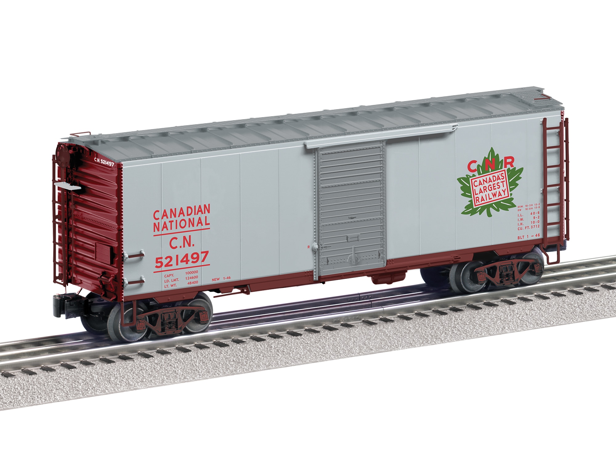 Canadian National PS-1 Boxcar #521497 Following World War II, several railroads experimented with aluminum bodied boxcars in an effort to reduce the car's weight. To further reduce weight and help show off the unique experiment, most of these cars, or at least the aluminum portions, were left unpainted. Many were used in express service and were equipped with steam lines for operation on passenger trains. When new, these shining metal boxcars must surely have stood out in any train! Although the concept did not catch on in large orders, most of these cars were successful enough to remain on their rosters into the early 1960s. This collection of our PS-1 boxcars is inspired by those attempts. Models feature plastic bodies with special metallic finishes to recreate this unique yet prototypical look. SKU: 2626200 Dimensions: Length: 11 1/4â Gauge: O Gauge rail line: Canadian National Minimum Radius: O31 Road Number: 521497 Manuals Find the latest manuals in our support section. Replacement Parts Buy any replacement parts in our support section. Contact Contact a service station to fix your product