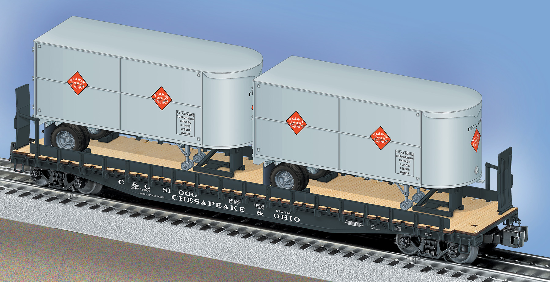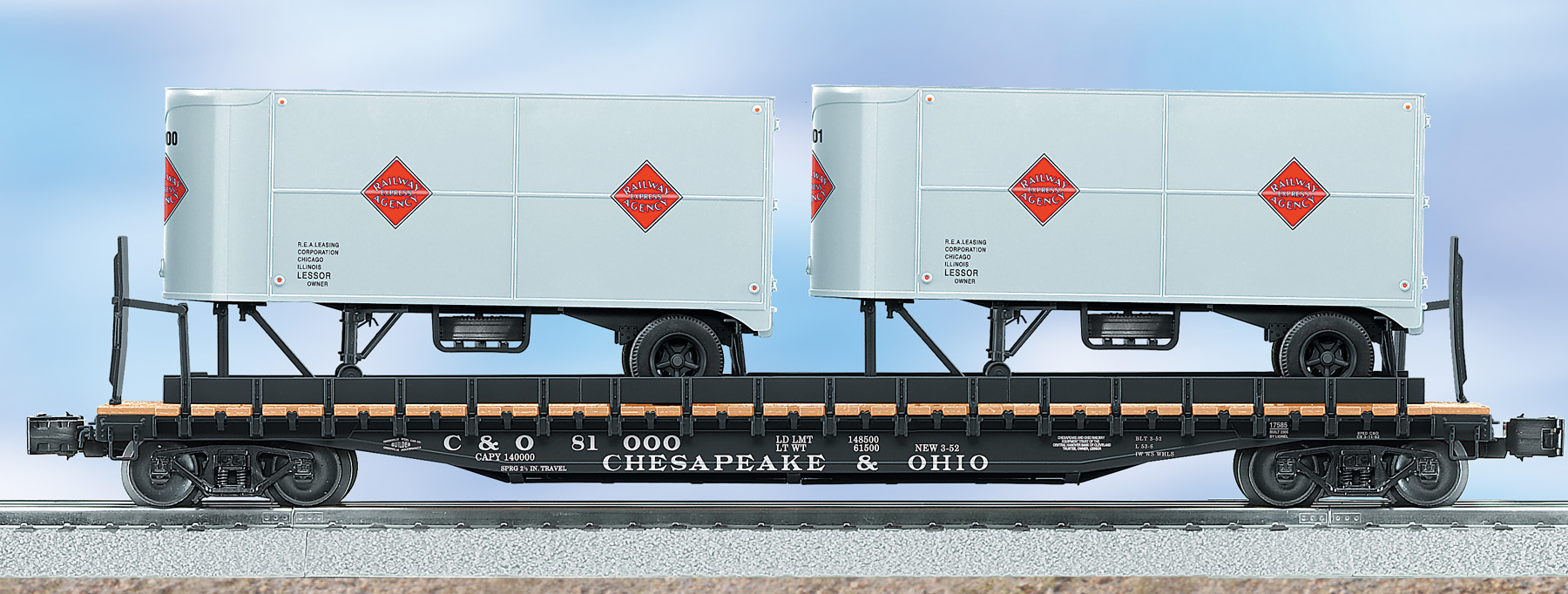 Chesapeake & Ohio PS-4 Flatcar with Piggyback Trailers #81000 PS-4 Flatcars with Piggyback Trailer SKU: 6-17585 Dimensions: Length: 14 3/4" Gauge: Standard O Scale price: 79.99 year: 2005 rail line: Chesapeake & Ohio Minimum Radius: O-36 Catalog Year: 2005 Catalog Title: Classic Trains Vol. 1 2005 Road Number: 81000 ADDITIONAL FEATURES: Hidden uncoupling tab Real wood deck Die-cast metal flatcar body Metal underframe details All-new bridge plates, side rails and removable wheel chocks Adjustable hitches on the flatcar deck All-new trailers with opening doors Adjustable landing gear wheels on the trailers Smooth sides on the REA trailers STANDARD O ROLLING STOCK FEATURES: Scale level of detail Scale proportions Die-cast metal sprung trucks and operating couplers Separately applied details Perfectly matched to Lionel Standard O Locomotives Manuals Find the latest manuals in our support section. Replacement Parts Buy any replacement parts in our support section. Contact Contact a service station to fix your product