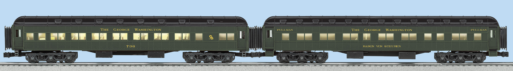Chesapeake & Ohio "The George Washington" Heavyweight Passenger Car 2-Pack The perfect complement to your C&O F-19 steam locomotive, these heavyweight cars feature classic decoration and detailed interiors. Lighting SKU: 6-15576 Dimensions: Length: Single car: 19" Gauge: Standard O Scale price: 264.99 year: 2006 rail line: Chesapeake & Ohio Minimum Radius: O-54 Catalog Year: 2007 Catalog Title: Lionel 2007 Train Catalog Volume 2 Road Number: None FEATURES: Die-cast metal sprung trucks and operating couplers with hidden uncoupling tab Flexible diaphragms between cars Opening doors Metal Frame Authentically detailed and painted interior Overhead interior lighting with ON/OFF switch Passenger and train crew figures SET INCLUDES: Coach, sleeper Manuals Find the latest manuals in our support section. Replacement Parts Buy any replacement parts in our support section. Contact Contact a service station to fix your product