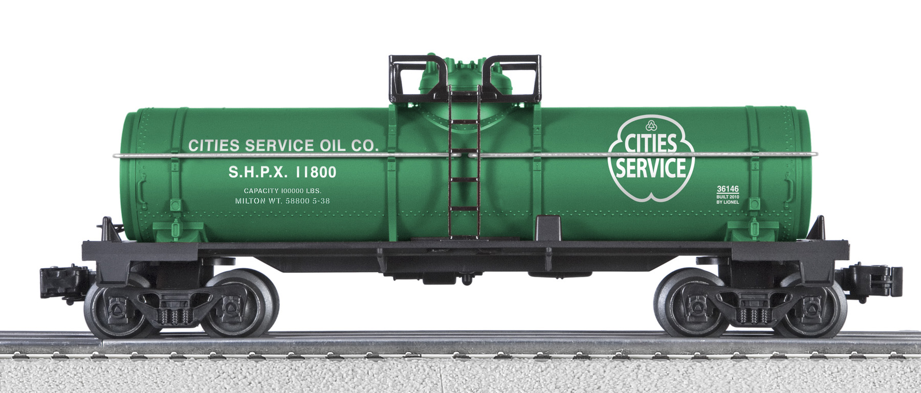 Cities Service Single-Dome Tank Car Colorful and durable, Lionel Traditional Freight Cars are great additions to any traditionally-sized Lionel train set. SKU: 6-36146 Dimensions: Length: 10” Gauge: Traditional O Gauge price: 39.99 year: 0 rail line: Cities Service Minimum Radius: O-27 Catalog Year: 2010 Catalog Title: Lionel 2010 Ready-to-Run Catalog Road Number: None Operating couplers Metal handrails and ladders Manuals Find the latest manuals in our support section. Replacement Parts Buy any replacement parts in our support section. Contact Contact a service station to fix your product