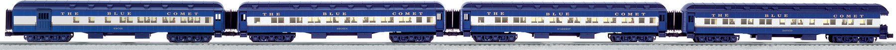 CNJ "Blue Comet" Heavywight Passenger Car 4-Pack Dressed for service with Central of New Jersey's The Blue Comet Pacific, these heavyweight cars create an elegant passenger train. Lighting SKU: 6-25655 Dimensions: 4-Pack Length: 76” Gauge: Standard O Scale price: 549.99 year: 2012 rail line: Central of New Jersey Minimum Radius: O-54 Catalog Year: 2013 Catalog Title: Lionel 2013 Signature Edition Road Number: None Die-cast metal sprung trucks and operating couplers Hidden uncoupling tabs Flexible diaphragms between cars Opening doors Detailed interiors with passenger figures Overhead interior lighting with On/Off switch Manuals Find the latest manuals in our support section. Replacement Parts Buy any replacement parts in our support section. Contact Contact a service station to fix your product