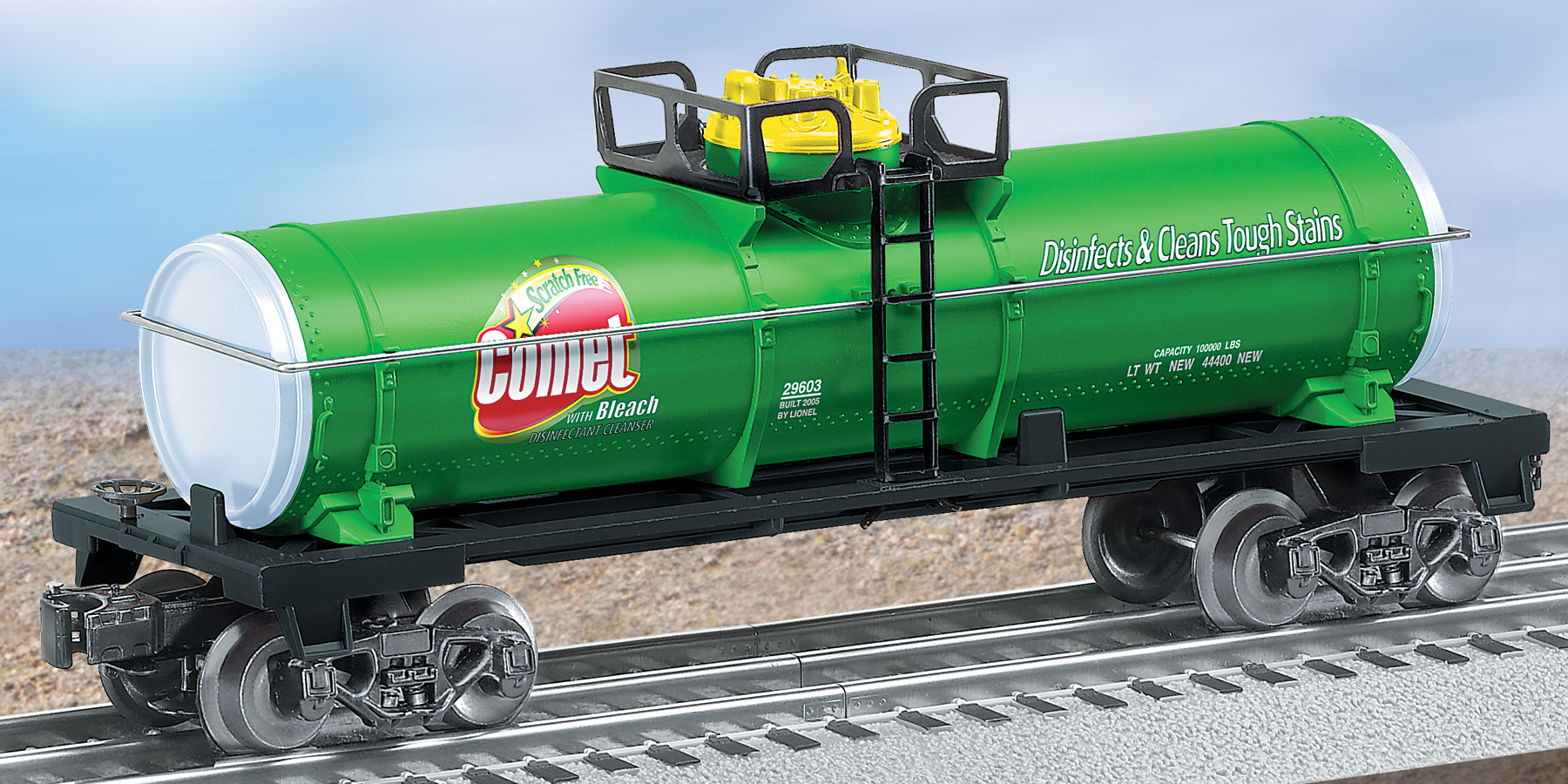 Comet Single-Dome Tank Car Traditional Freight Car: Comet Single-Dome Tank Car SKU: 6-29603 Dimensions: Length: 10” Gauge: Traditional O Gauge price: 52.99 year: 2005 rail line: Comet Minimum Radius: O-27 Catalog Year: 2005 Catalog Title: Classic Trains Vol. 2 2005 Road Number: None ADDITIONAL FEATURES: Die-cast metal trucks and operating couplers Metal handrails, platform and ladders TRADITIONAL FREIGHT CAR FEATURES: Operating couplers – uncouple cars automatically with a remote-control or uncoupling track section Colorful paint scheme Officially licensed car Collectible series Perfect additions to Lionel train sets Perfectly sized to match Lionel Traditional Locomotives Manuals Find the latest manuals in our support section. Replacement Parts Buy any replacement parts in our support section. Contact Contact a service station to fix your product