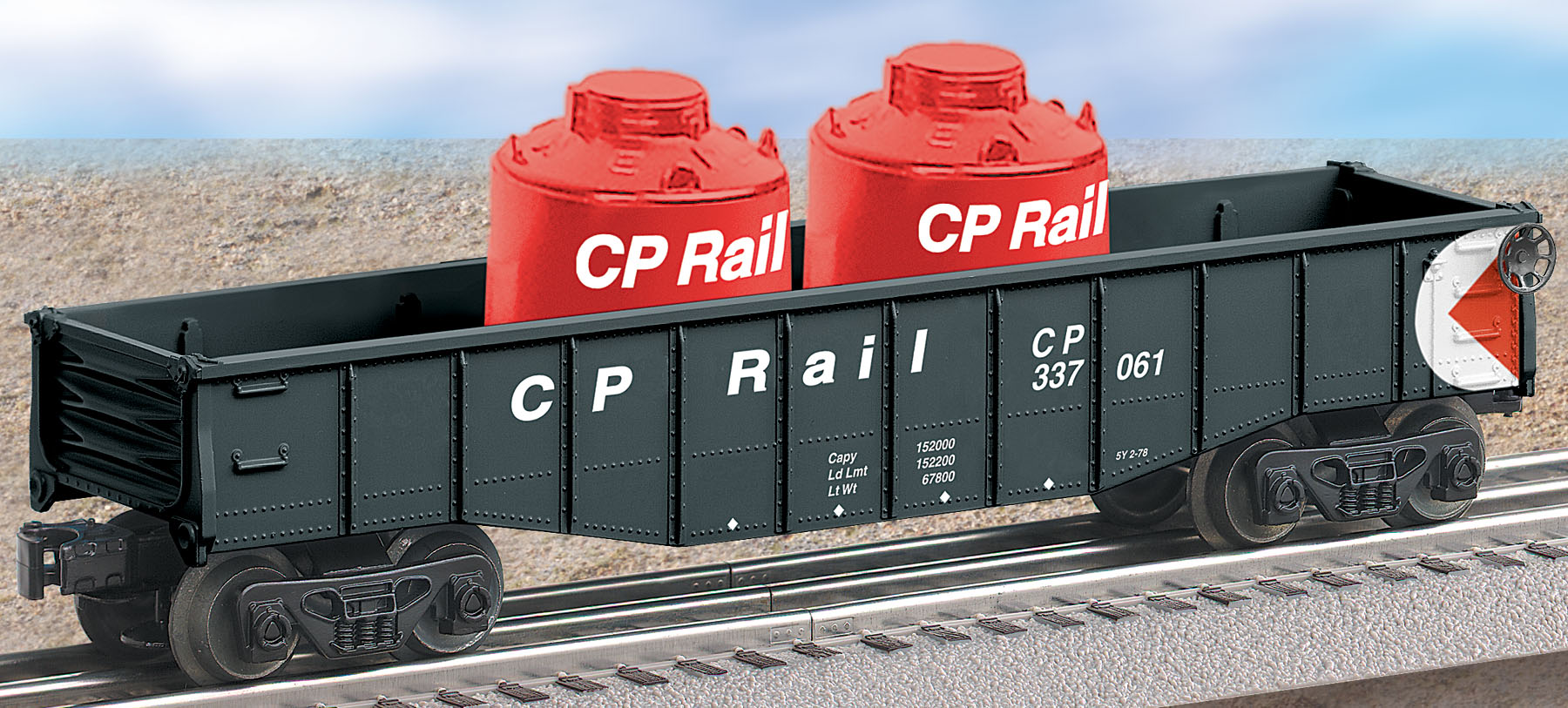 CP Rail O27 Gondola with Canisters None SKU: 6-26332 Dimensions: Length: 10 1/4" Gauge: Traditional O Gauge price: 29.99 year: 2007 rail line: Canadian Pacific Minimum Radius: O-27 Catalog Year: 2007 Catalog Title: Lionel 2007 Train Catalog Volume 1 Road Number: None ADDITIONAL FEATURES: Two removable canisters on gondola Traditional Freight Cars Operating couplers–uncouple cars automatically with a remote-control or uncoupling track section Colorful paint schemes Officially licensed cars Collectible series Perfect additions to Lionel train sets Perfectly sized to match Lionel Traditional Locomotives Minimum Curve: O-27 (Except where noted) Manuals Find the latest manuals in our support section. Replacement Parts Buy any replacement parts in our support section. Contact Contact a service station to fix your product