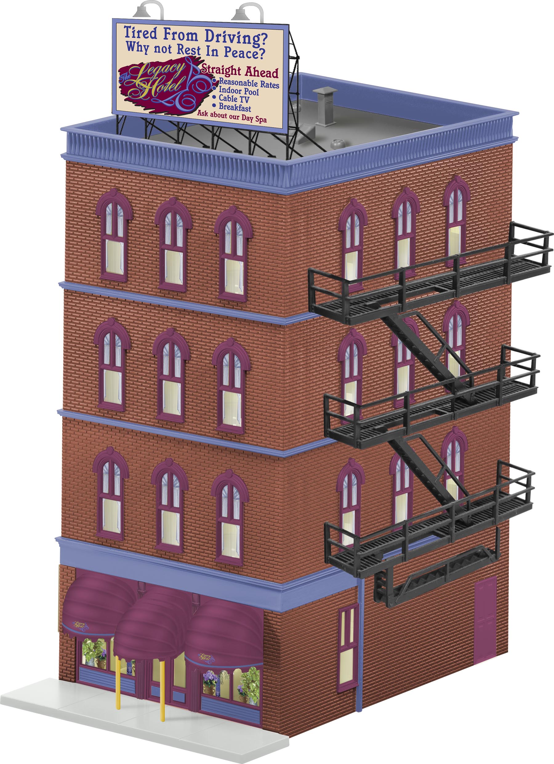 Loaded with new details, this special hotel includes a fire escape on the side, a lighted billboard and smokestack on the roof, and even an exhaust fan and central air units in the rear. Look through the windows to view realistic interior decoration and window drapery.