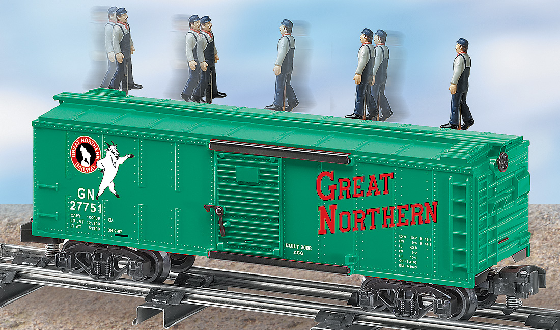 Great Northern Walking Brakeman Car None Action SKU: 6-49031 Dimensions: Length: 8 3/8” Gauge: American Flyer/S Gauge price: 79.99 year: 2006 rail line: Great Northern Minimum Radius: None Catalog Year: 2006 Catalog Title: Classic Trains Vol. 1 2006 Road Number: None ADDITIONAL FEATURES: Brakeman moves smoothly back and forth along roofwalk via track power Maintenance-free motor Metal frame AMERICAN FLYER S Gauge Operating couplers Classic A.C. Gilbert reissues All-new innovative designs Manuals Find the latest manuals in our support section. Replacement Parts Buy any replacement parts in our support section. Contact Contact a service station to fix your product