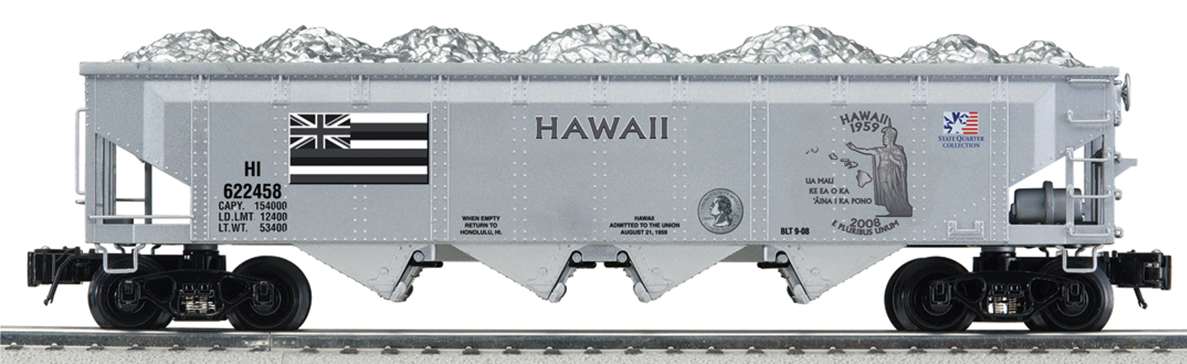 Hawaii State Quarter Die Cast 4-Bay Hopper Bank None SKU: 6-22458 Dimensions: 11.25" Length Gauge: Standard O Scale price: 74.99 year: 0 rail line: None Minimum Radius: O-31 Catalog Year: 2009 Catalog Title: K-Line by Lionel 2009 Vol. 1 Road Number: None Features: Bank Slot in Top Separate Metal Details Underside Chassis Details Spring-Loaded Opening Drop Doors Die Cast Sprung Trucks Operating Die Cast Couplers Manuals Find the latest manuals in our support section. Replacement Parts Buy any replacement parts in our support section. Contact Contact a service station to fix your product