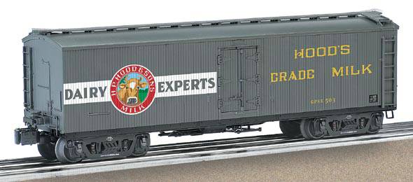 Hood's (2nd version) General American Milk Car #505 From the detailed underframe to the sprung buffers to the plated interior tanks and piping, Lionel General American Milk Cars have raised the bar for O gauge rolling stock. Each of the previous released liveries is now available in two new road numbers. Built in the early 1900s, milk cars frequently ran along passenger routes to get their perishable cargo to market as quickly as possible. The wooden milk cars were a fixture on many railroads until the 1950s. SKU: 6-17375 Dimensions: Length: 11 3/4" Gauge: Standard O Scale price: 59.99 year: 2004 rail line: Hood's Minimum Radius: O-31 Catalog Year: 2003 Catalog Title: Classic Trains Vol. 2 2003 Road Number: None General American Milk Car - 1/04 FEATURES: Die-cast metal passenger-style sprung trucks and operating couplers with hidden uncoupling tab Die-cast metal sprung buffers Opening doors Removable roof Plated interior milk tanks and piping Metal brake lever and brake chain Separately applied metal details Manuals Find the latest manuals in our support section. Replacement Parts Buy any replacement parts in our support section. Contact Contact a service station to fix your product