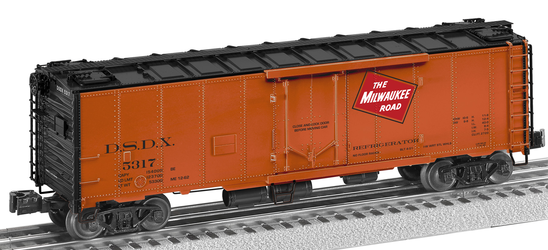 Milwaukee Road Scale 40' Steel Sided Reefer #5317 40‘ STEEL-SIDED REFRIGERATOR CAR SKU: 6-27345 Dimensions: Length: 11 ½” Gauge: Standard O Scale price: 79.99 year: 2012 rail line: Milwaukee Road Minimum Radius: O-31 Catalog Year: 2012 Catalog Title: Lionel 2012 Signature Edition Road Number: 5317 Die-cast metal sprung trucks and operating couplers Hidden uncoupling tabs Separately applied metal underframe details Opening roof hatches with props Opening hinged-style doors Manuals Find the latest manuals in our support section. Replacement Parts Buy any replacement parts in our support section. Contact Contact a service station to fix your product