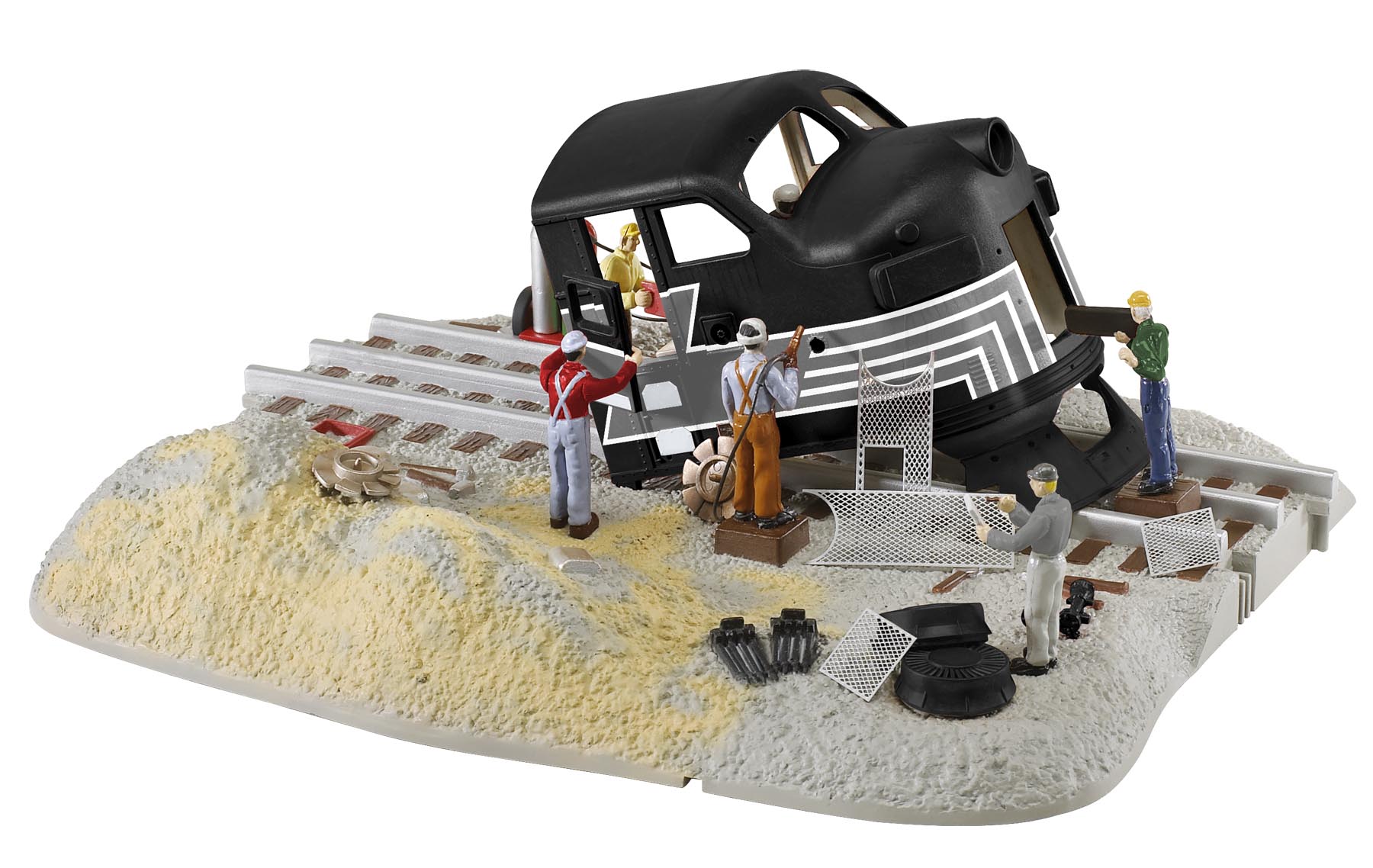 New York Central Scrap Yard This tired diesel locomotive has reached the end of the line. These busy workers are scrapping the locomotive. Watch the workers lift away the seat, remove the number board, and cut through the side. Action Lighting SKU: 6-37961 Dimensions: 8 1/4” x 7 1/2” 3 1/4” Gauge: Traditional O Gauge price: 109.99 year: 0 rail line: New York Central Minimum Radius: None Catalog Year: 2013 Catalog Title: Lionel 2013 Signature Edition Road Number: None Four animations Seven hand-painted figures Flickering LED simulates a welder's torch Manuals Find the latest manuals in our support section. Replacement Parts Buy any replacement parts in our support section. Contact Contact a service station to fix your product