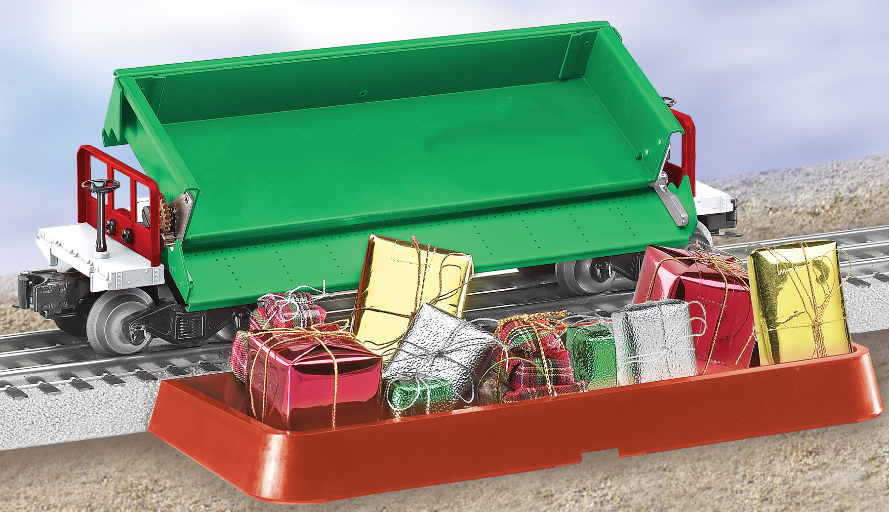 O Gauge Christmas Dump Car with Presents The holidays are coming! This car is ready to unload some of the most important presents from Santas list. Action SKU: 6-26870 Dimensions: Length: 9 1/2” Gauge: Traditional O Gauge price: 79.99 year: 2006 rail line: None Minimum Radius: O-27 Catalog Year: 2006 Catalog Title: 2006 Lionel Christmas Catalog Road Number: None Christmas Dump Cars - 5/05 FEATURES: Die-cast metal trucks and operating couplers Unload presents at the touch of a button Remote Control track section required Includes 10-piece present load and unloading bin Die-cast metal frame and metal dumping frame Manuals Find the latest manuals in our support section. Replacement Parts Buy any replacement parts in our support section. Contact Contact a service station to fix your product