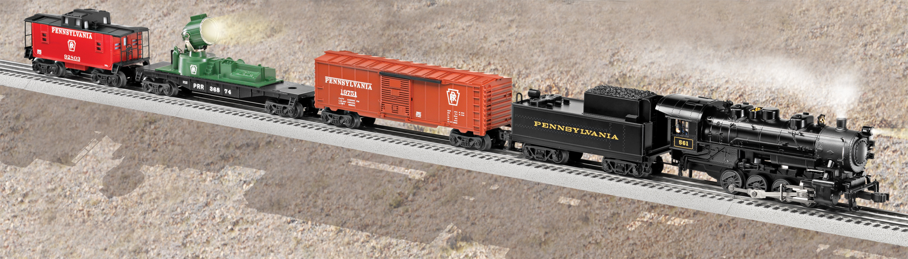 - 0-8-0 steam locomotive and tender, boxcar, searchlight car, caboose, three straight FasTrack track sections, eight curved FasTrack track sections, a FasTrack terminal section, CW-80 Transformer, smoke fluid, billboard, ten telephone poles, six construction signs