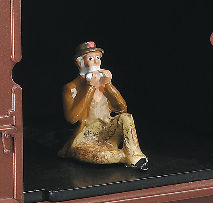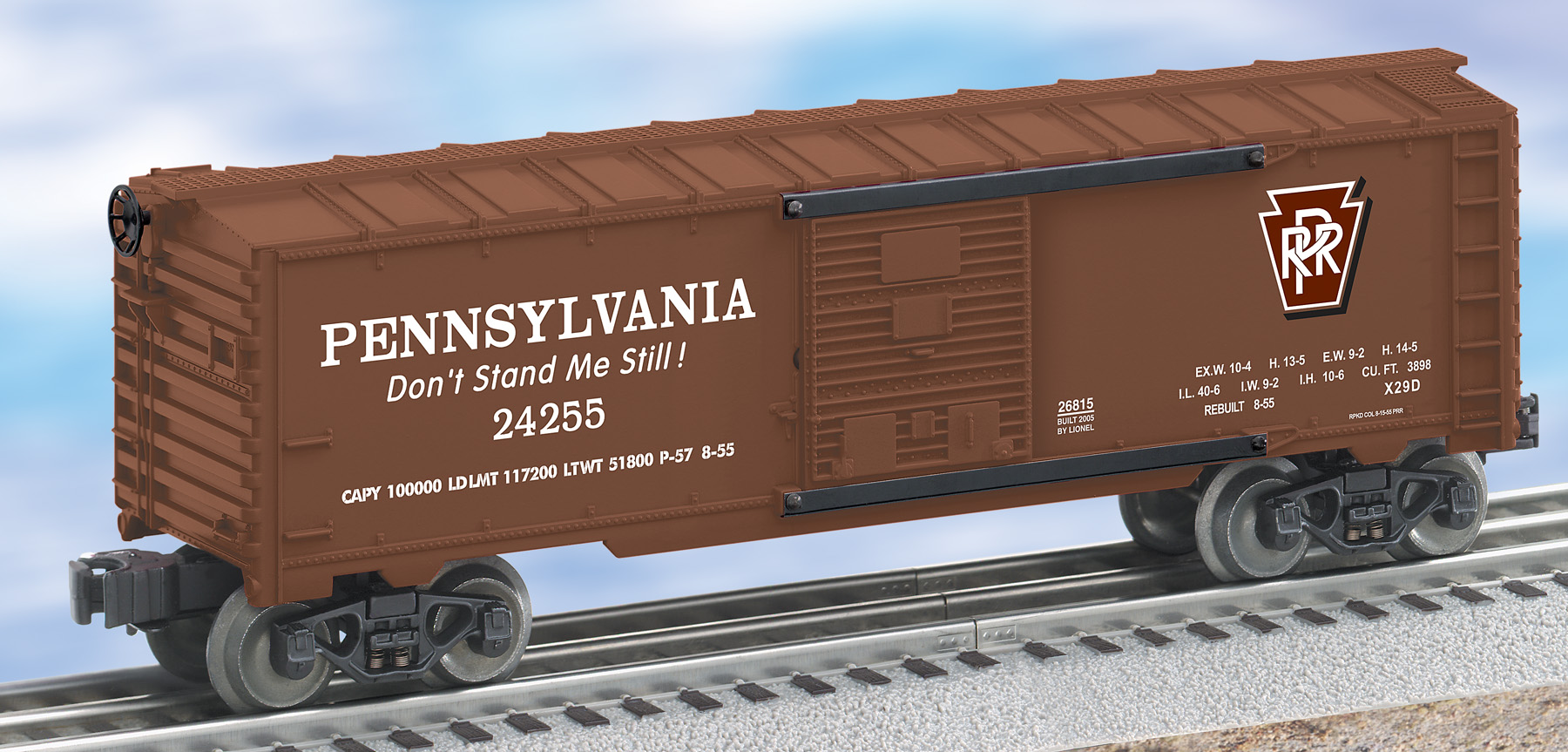 Pennsylvania Workin on the Railroad Boxcar None Action Sounds SKU: 6-26815 Dimensions: Length: 10 1/2” Gauge: Traditional O Gauge price: 62.99 year: 2005 rail line: Pennsylvania Minimum Radius: O-27 Catalog Year: 2005 Catalog Title: Classic Trains Vol. 2 2005 Road Number: None Hobo Music Boxcar - 3/05 ADDITIONAL FEATURES: Plays “I’ve been Working on the Railroad” on harmonica (nine-volt battery required, not included) ON/OFF switch Opening doors Hand-painted hobo figure OPERATING CARS Lights, sound, action Die-cast metal trucks and operating couplers Classic reissues All-new innovative designs Perfect additions to Lionel train sets Minimum Curve: O-27 (except where noted) Manuals Find the latest manuals in our support section. Replacement Parts Buy any replacement parts in our support section. Contact Contact a service station to fix your product