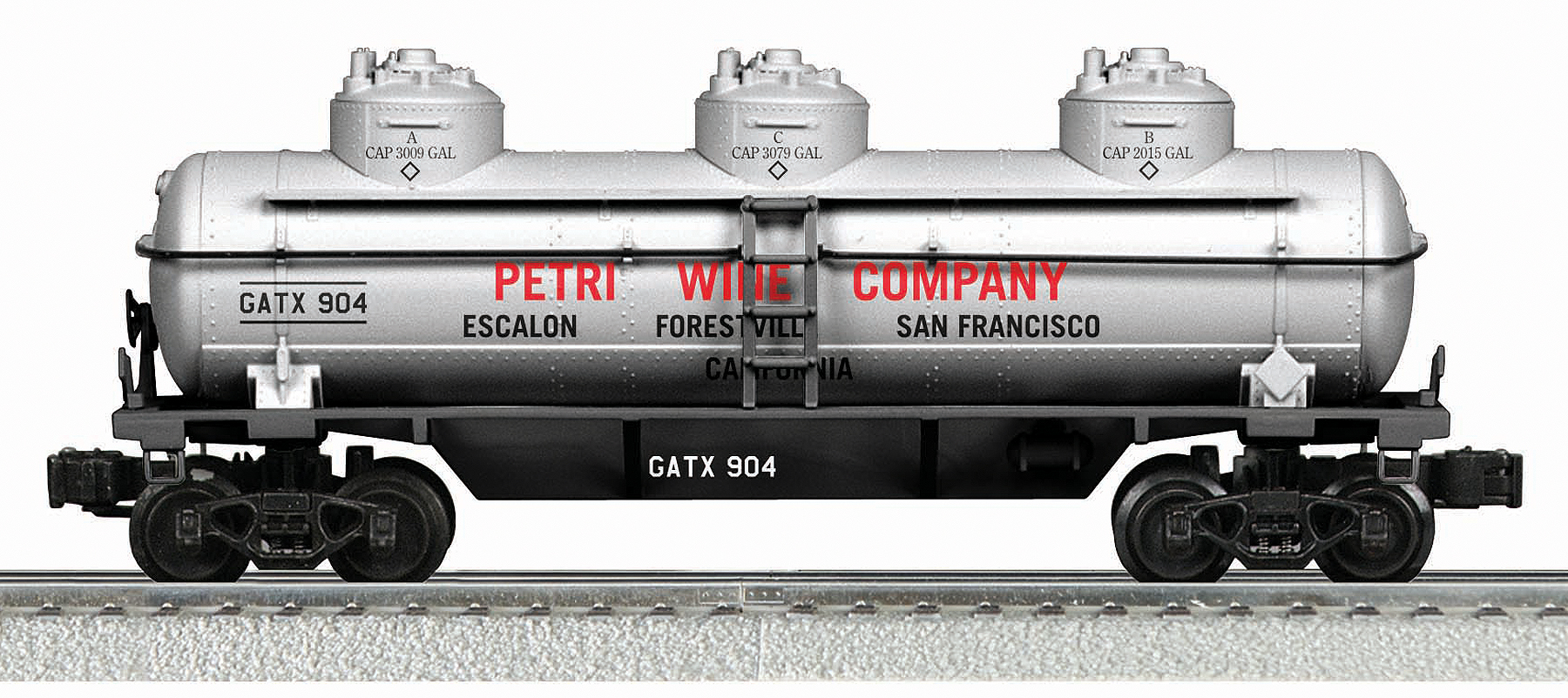 Petri Wine Company Three-Dome Tank Car w/ Die Cast Chassis None SKU: 6-22297 Dimensions: 10.5" Length Gauge: Standard O Scale price: 51.99 year: 0 rail line: Petri Wine Company Minimum Radius: O-31 Catalog Year: 2009 Catalog Title: K-Line by Lionel 2009 Vol. 1 Road Number: None Features: 1:48 Scale Fully Sprung Die Cast Trucks Die Cast Operating Couplers Add-On Details O-31 Operation Die Cast Chassis Metal Brakewheel Separate Metal Grab Rails & Ladders Opening Dome Top Diamond Warning Markers Manuals Find the latest manuals in our support section. Replacement Parts Buy any replacement parts in our support section. Contact Contact a service station to fix your product
