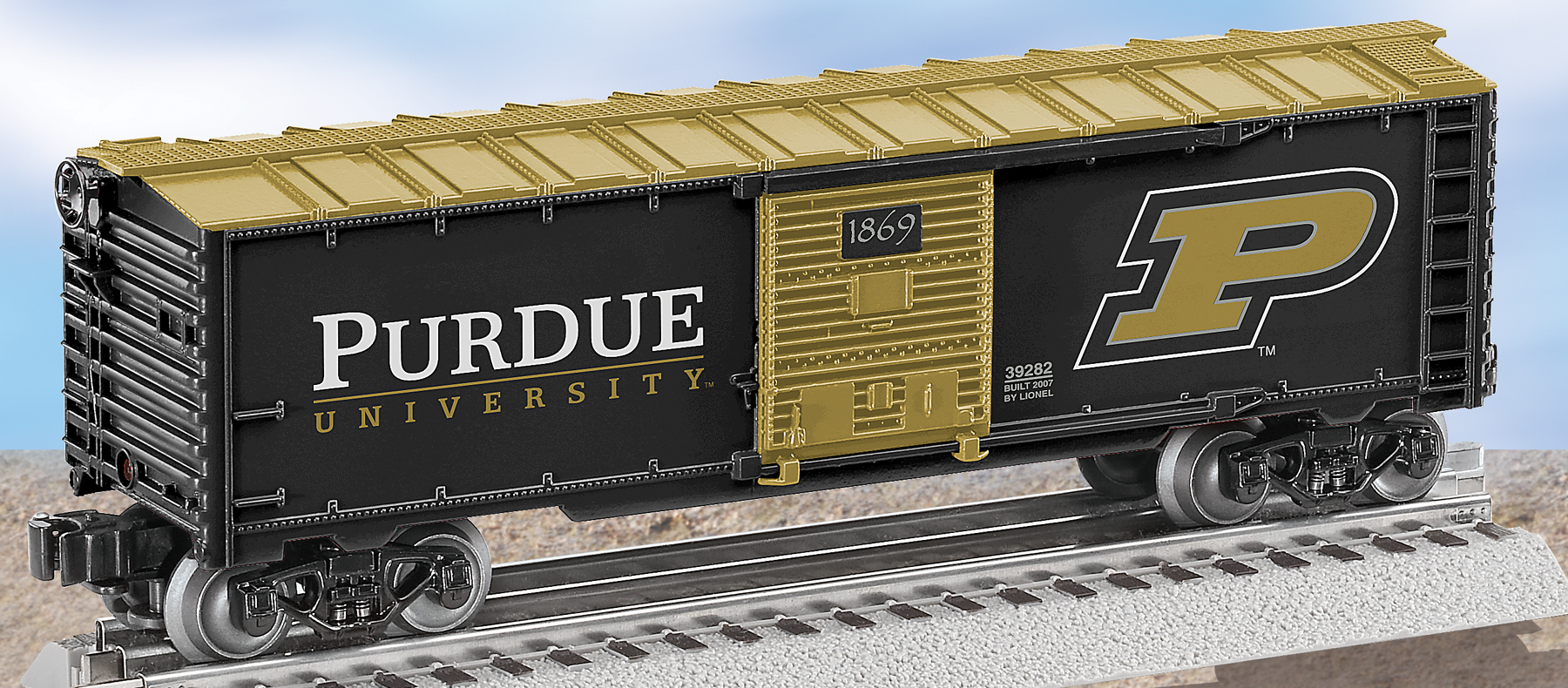 Purdue University Boxcar® The Purdue University boxcar makes a great graduation, birthday, or holiday gift for new grads and alums of any age. Or, give yourself a present — this handsome boxcar. Only from Lionel. SKU: 6-39282 Dimensions: Length: 10 1/4" Gauge: Traditional O Gauge price: 49.99 year: 2007 rail line: None Minimum Radius: O-27 Catalog Year: 2008 Catalog Title: Lionel Signature Catalog 2008 Volume 1 Road Number: None FEATURES: Die-cast metal sprung trucks and operating couplers Metal frame Opening doors Manuals Find the latest manuals in our support section. Replacement Parts Buy any replacement parts in our support section. Contact Contact a service station to fix your product
