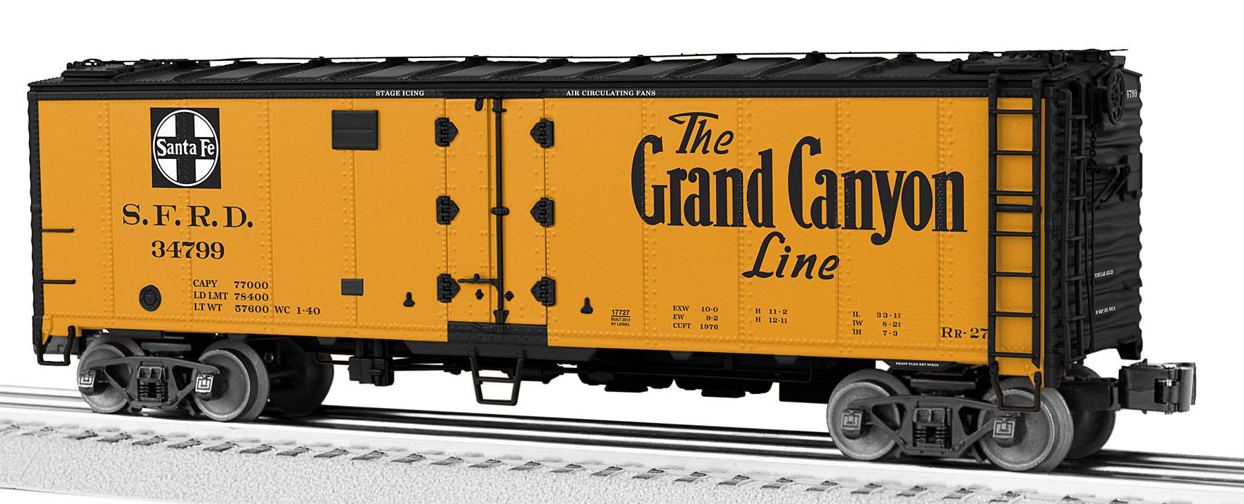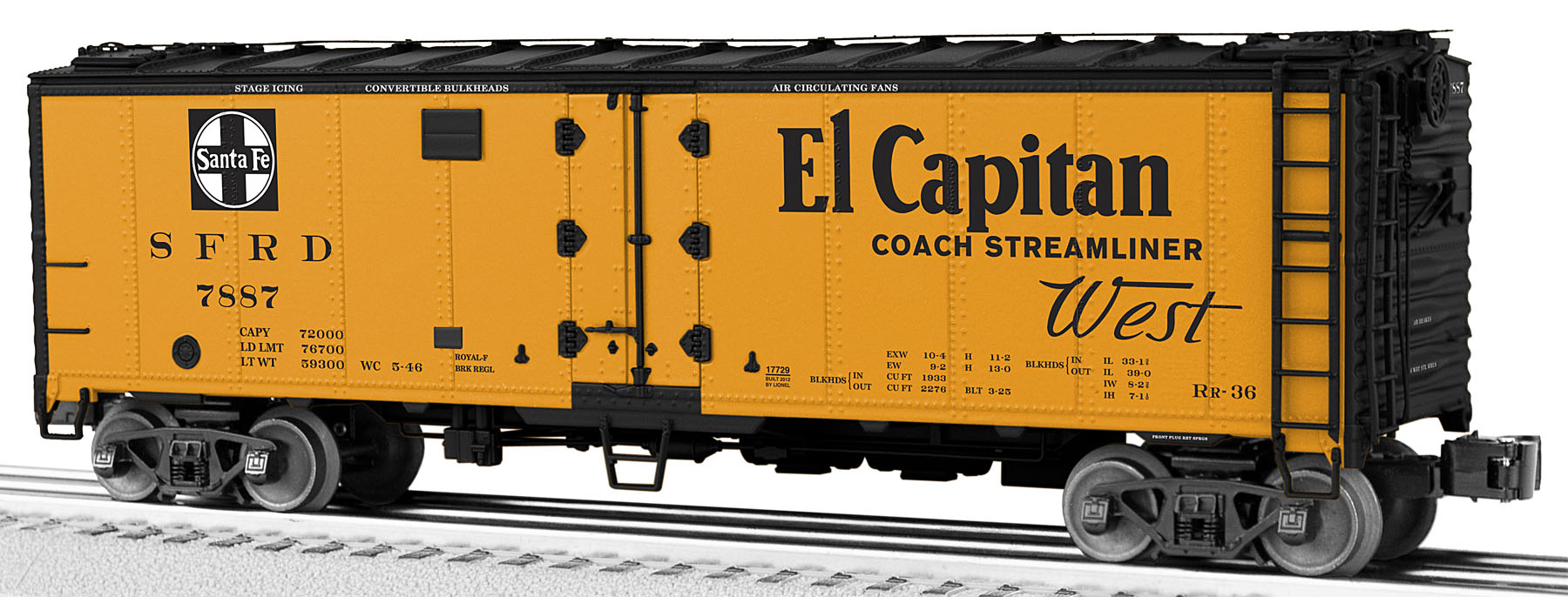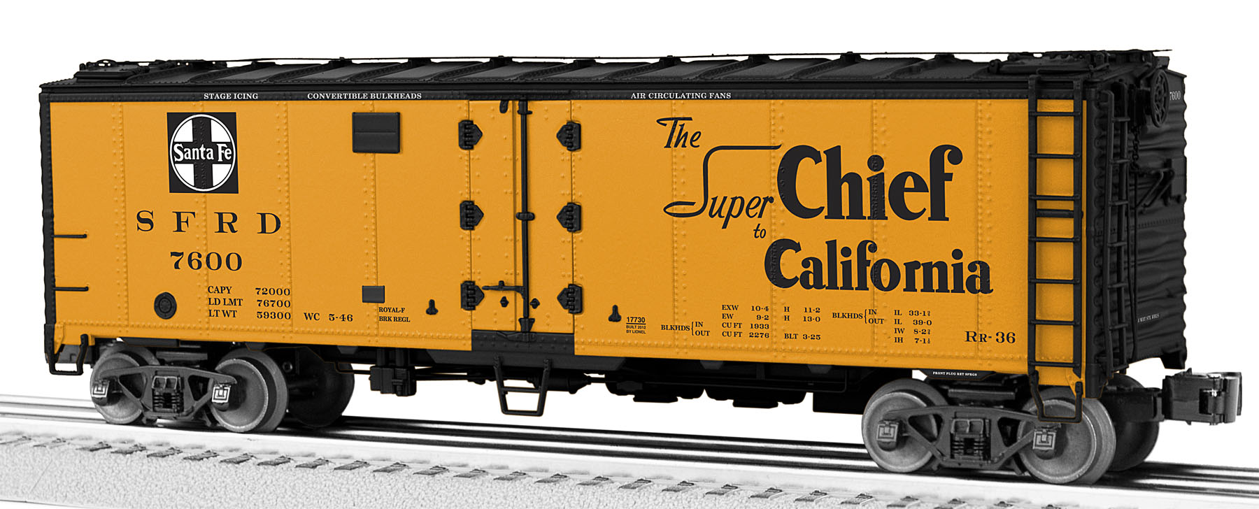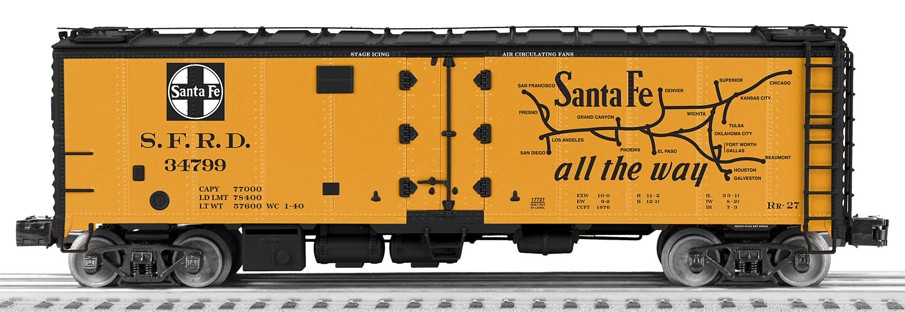 MAP & SLOGAN REFRIGERATOR CARSBeginning in 1940, the Santa Fe Railroad initiated a new series of promotional decoration on their fleet of steel-sided refrigerator cars. One of five ATSF passenger line slogans – Grand Canyon Line, Scout, El Capitan, Super Chief, and Chief – was featured on a single side of each car. On the opposite side of each reefer, a large Santa Fe system map was boldly applied.