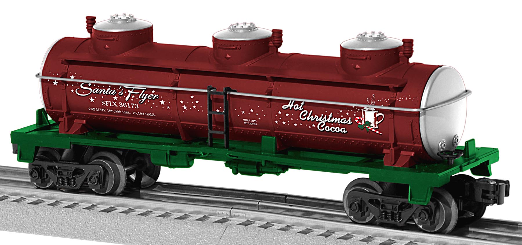 Santa's Flyer Hot Cocoa Three-Dome Tank Car This tank car is filled with fine cocoa for making delicious hot chocolate SKU: 6-36173 Dimensions: Length: 10” Gauge: Traditional O Gauge price: 39.99 year: 0 rail line: None Minimum Radius: O-27 Catalog Year: 2011 Catalog Title: A Christmas Tradition 2011 Road Number: None Operating couplers Metal handrails and ladders Manuals Find the latest manuals in our support section. Replacement Parts Buy any replacement parts in our support section. Contact Contact a service station to fix your product