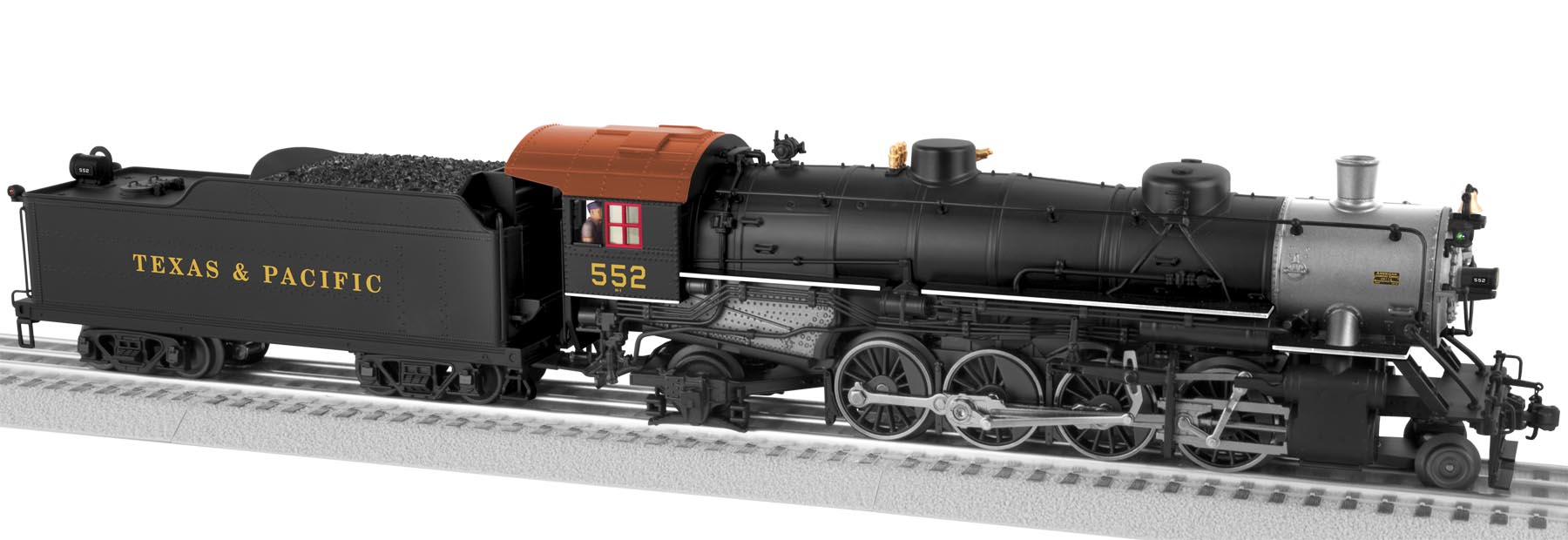 Texas & Pacific 2-8-2 Mikado LEGACY Steam Locomotive #552 2-8-2 MIKADO STEAM LOCOMOTIVEFirst used on Japanese railways in the early 1900s, the Mikado steam locomotive became one of the principal freight locomotives of North America. The excellent starting tractive effort of these 2-8-2 steam locomotives made them great fast-speed haulers of heavy freight, securing them a place of importance on American railways. ElectroCouplers LEGACY Control System Lighting Smoke Unit Wireless Tether Odyssey System II LEGACY RailSounds SKU: 6-11288 Dimensions: Length: 20 ¾” Gauge: Standard O Scale price: 899.99 year: 0 rail line: Texas & Pacific Minimum Radius: O-36 Catalog Year: 2011 Catalog Title: Lionel 2011 Signature Edition Road Number: #552 2-8-2 Mikado (LEGACY) - 6/11 <b>LEGACY Control System</b> equipped – able to run in LEGACY Control mode, in TrainMaster Command Control mode, or in Conventional mode with a standard transformer <b>Odyssey II Speed Control</b> with On/Off switch <b>LEGACY RailSounds</b> system featuring:- CrewTalk dialog and TowerCom announcements, each with different scenarios depending on whether the locomotive is in motion or stopped- DynaChuff synchronized with 32 levels of intensity as the locomotive gains speed- LEGACY "Real-Time Quilling Whistle" control with instant response for realistic signature 'quilling' and correctly timed warning signals- Single hit or continuous mechanical bell sounds Powerful maintenance-free motor with momentum flywheel <b>Wireless Tether </b>connection between locomotive and tender <b>ElectroCouplers</b> on rear of tender Directional lighting including operating headlight and back-up light on rear of tender Illuminated classification lights on the front of locomotive Traction tires Fan-driven smoke unit Adjustable smoke output Interior illumination in cab Die-cast metal locomotive body, pilot, and frame Die-cast metal tender body and trucks High level of separately applied metal details Separately applied builder's plates Authentically detailed cab interior Glowing firebox in cab Cab glass windows Engineer and fireman figures Manuals Find the latest manuals in our support section. Replacement Parts Buy any replacement parts in our support section. Contact Contact a service station to fix your product