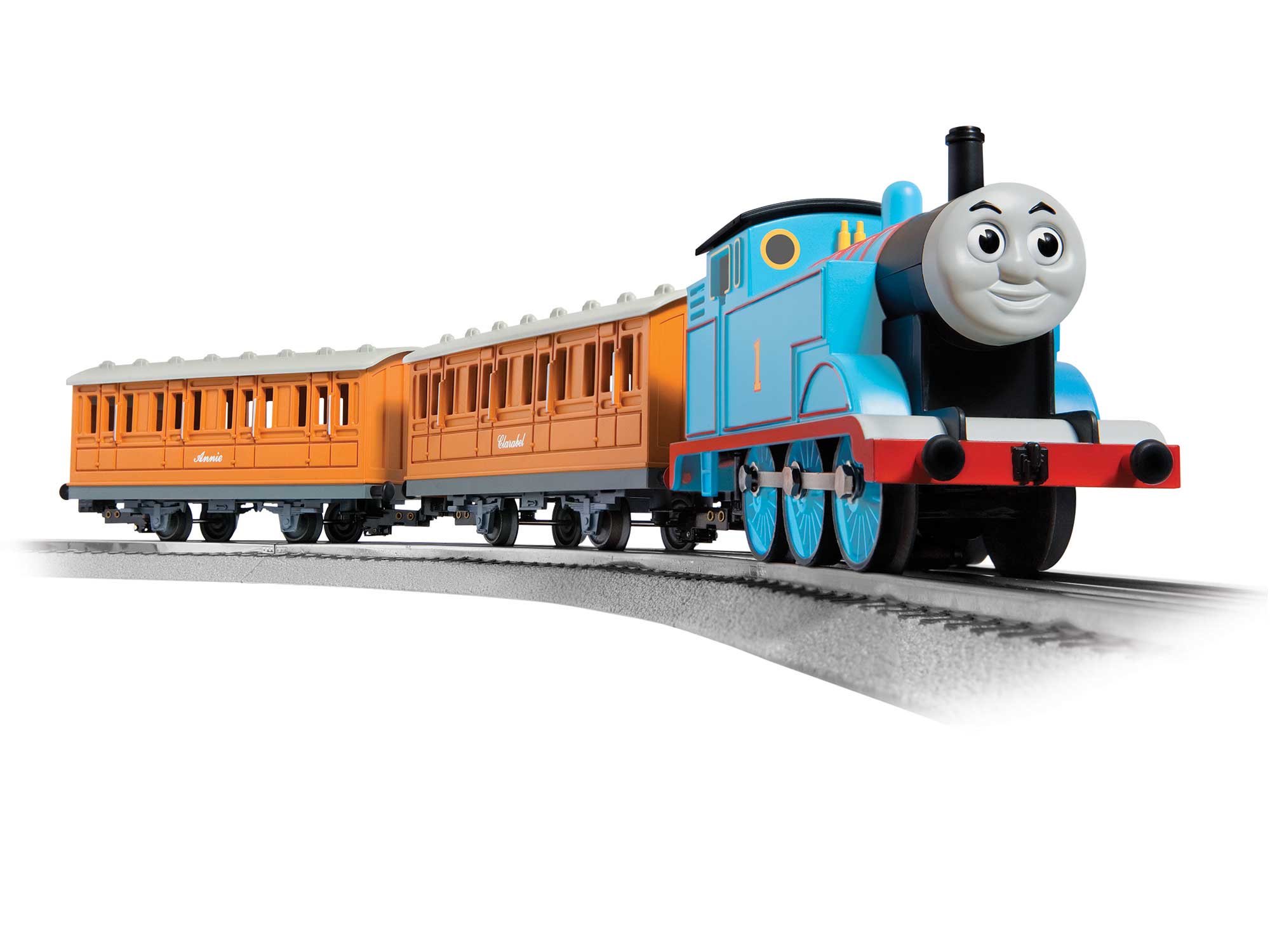 - Thomas the Tank Engine™ with three interchangeable faces, Annie, Clarabel, three play figures, three straight FasTrack track sections, eight curved FasTrack track sections, a FasTrack terminal section, powerful Lionel PowerMax transformer