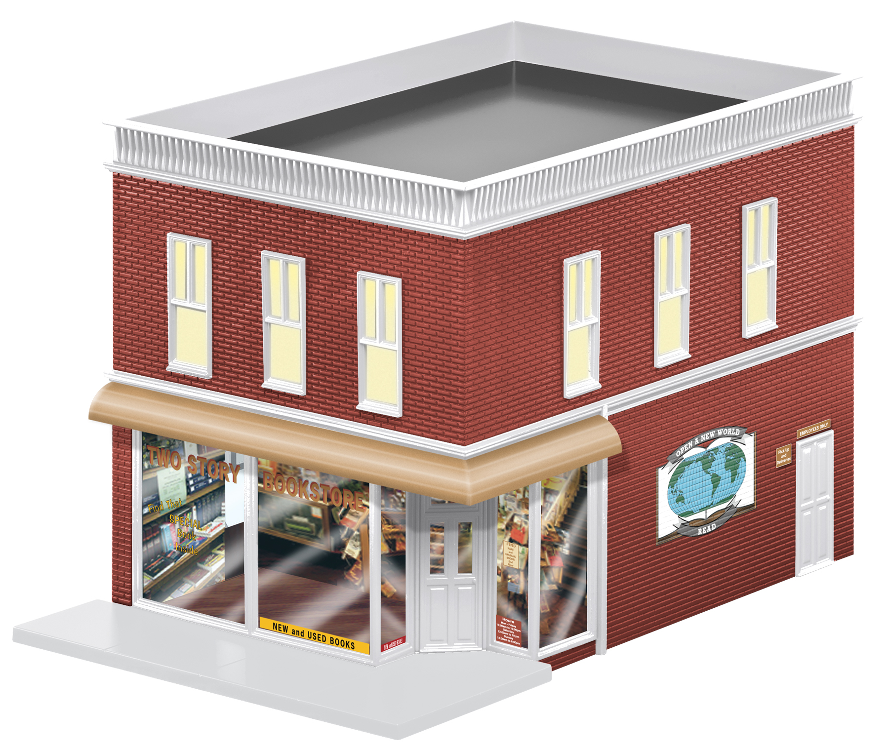 Two-Story Bookstore There’s a world of reading inside the Two Story Bookstore! Wander through the rows of books until you find something that intrigues you. Relax and take advantage of the peaceful silence and comfortable chairs. And look - a staircase to the second floor allows you access to a vast collection of rare and unusual books. With so many stories at your fingertips, it is a great place in Lionelville to read the day away. Lighting SKU: 6-16845 Dimensions: Approx. 9 1/4” x 6” x 7” Gauge: Traditional O Gauge price: 59.99 year: 0 rail line: None Minimum Radius: None Catalog Year: 2009 Catalog Title: Lionel 2009 Volume II Road Number: None Features: Interior illumination Decorated interior Simulated canopy at building front Manuals Find the latest manuals in our support section. Replacement Parts Buy any replacement parts in our support section. Contact Contact a service station to fix your product