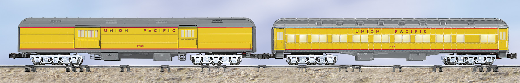 Union Pacific Heavyweight Passenger Car 2-Pack Pulled behind your Union Pacific Northern, the American Flyer Heavyweight Passenger Car 2-Pack create an impressive consist. The 2-pack features a baggage car and a coach. Each car features die-cast metal six-wheel trucks and a lighted interior.. Lighting SKU: 6-48983 Dimensions: Approx. 23 1/2” Gauge: American Flyer/S Gauge price: 139.99 year: 2006 rail line: Union Pacific Minimum Radius: None Catalog Year: 2006 Catalog Title: Classic Trains Vol. 1 2006 Road Number: None Heavyweight Passenger Cars - 8/06 FEATURES: Die-cast metal trucks and operating couplers Interior lighting with ON/OFF control Metal frames Underbody detail Manuals Find the latest manuals in our support section. Replacement Parts Buy any replacement parts in our support section. Contact Contact a service station to fix your product