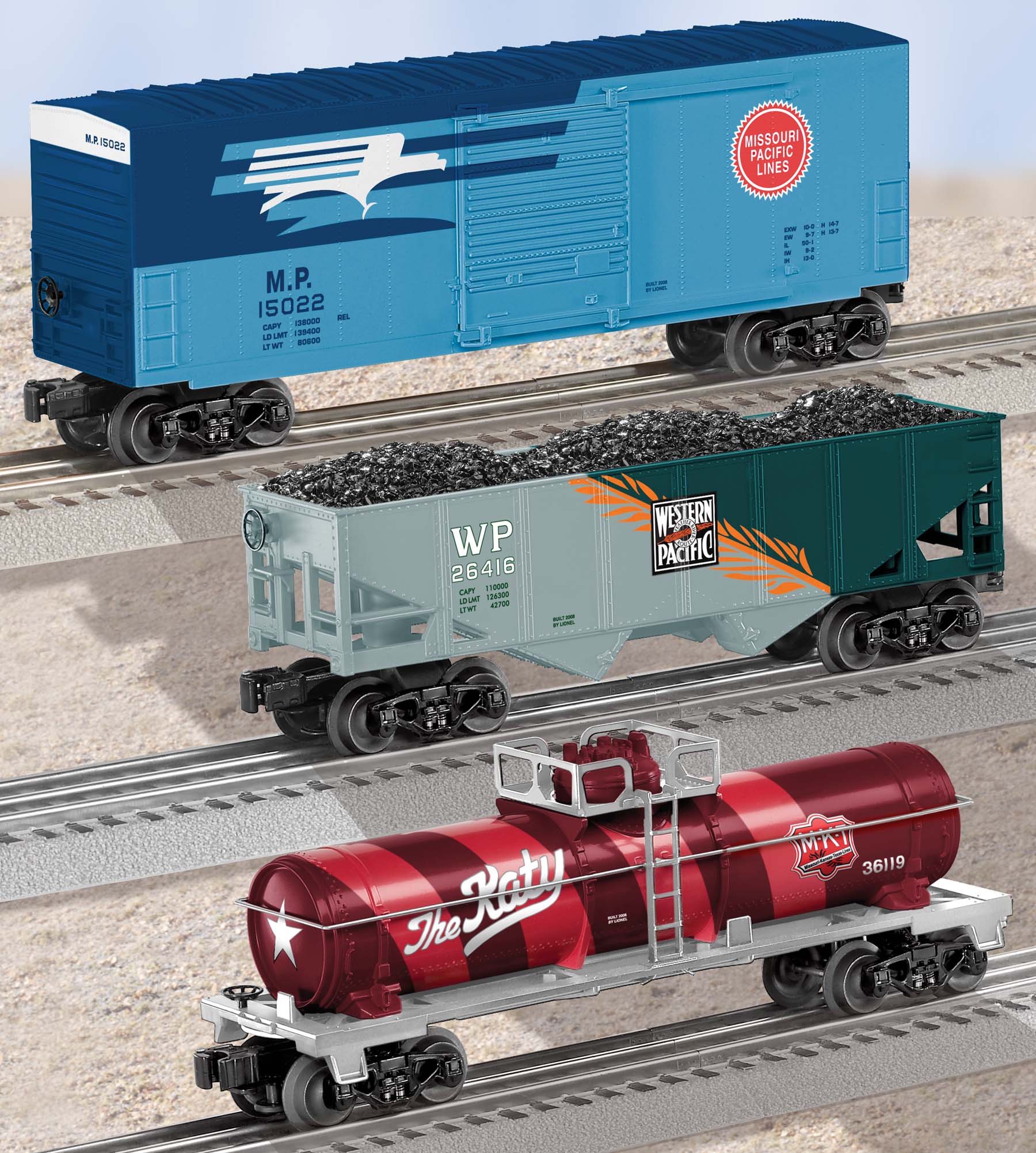 Union Pacific Heritage Cars 3-Pack Each car in the pack pays homage to the new and colorful Heritage schemes recently unveiled by Union Pacific on their SD70ACe heritage locomotives. The perfect addition to the Union Pacific Merger Special set. SKU: 6-30082 Dimensions: Length: 30" (set) Gauge: Traditional O Gauge price: 99.99 year: 2008 rail line: Mixed Road Names Minimum Radius: O-27 Catalog Year: 2008 Catalog Title: Lionel 2008 Train Catalog Volume 2 Road Number: None 3-PACK INCLUDES: Missouri Pacific Hi-Cube Boxcar, MKT Single-Dome Tank car, Western Pacific Hopper FEATURES: Die-cast metal trucks and operating couplers Removable coal load in hopper Metal handrails, platform, and ladders on tank car Opening doors on boxcar Each car in pack is individually boxed Manuals Find the latest manuals in our support section. Replacement Parts Buy any replacement parts in our support section. Contact Contact a service station to fix your product