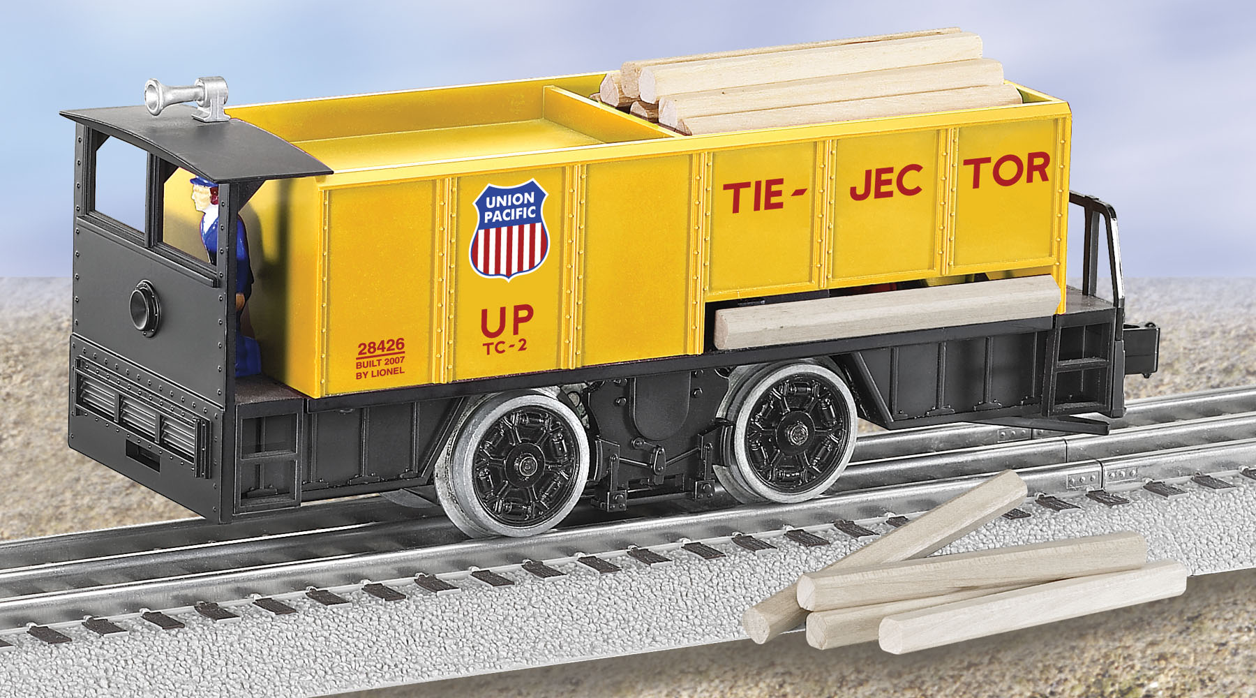 Union Pacific Tie-jector #TC-2 This Union Pacific Tie-jector car provides O-gauge action and fun to any layout. Watch as the wooden ties in the back of the Tie-Jector shoot out of the side when the car reaches one of the included track trips. You and your friends will enjoy hours of fun with this unusual car! Action SKU: 6-28426 Dimensions: Length: 7 1/8" Gauge: Traditional O Gauge price: 89.99 year: 2007 rail line: Union Pacific Minimum Radius: O-27 Catalog Year: 2007 Catalog Title: Lionel 2007 Train Catalog Volume 2 Road Number: TC-2 FEATURES: 20 wooden ties Two track trips Precision can motor Molded plastic body Plastic frame Traction tires Manuals Find the latest manuals in our support section. Replacement Parts Buy any replacement parts in our support section. Contact Contact a service station to fix your product