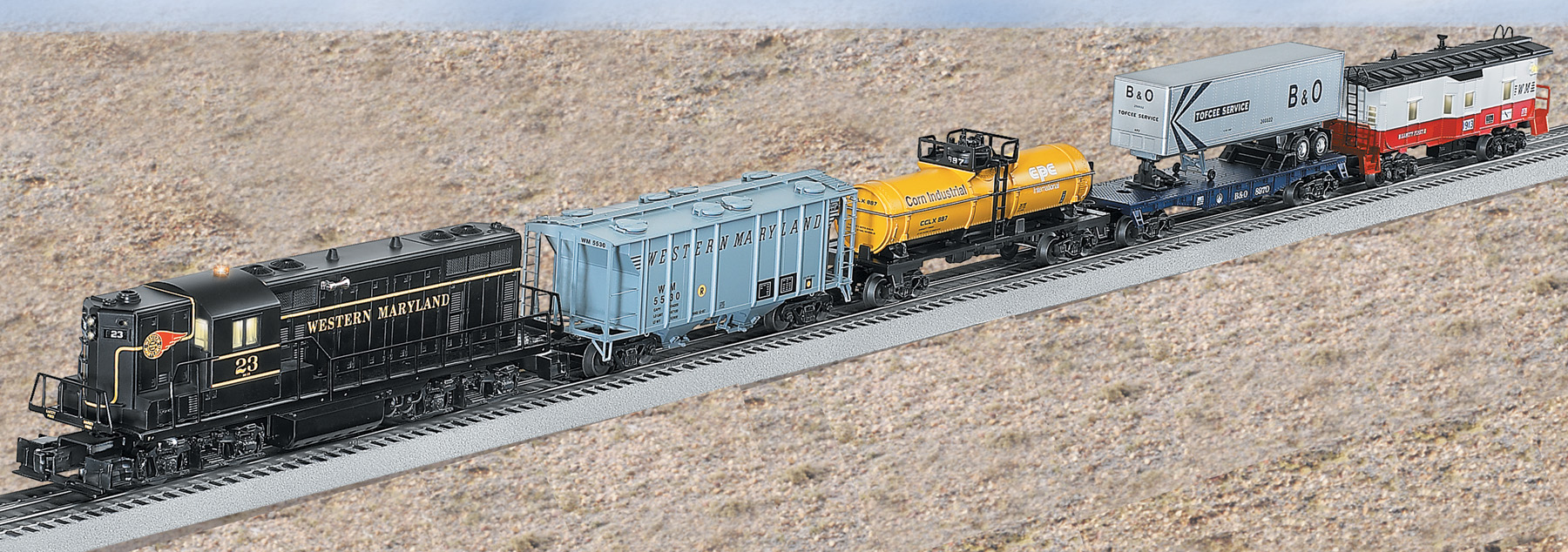 Western Maryland Fireball Freight (Conv. GP7 #23) Perfect for those who prefer to run in a non-Command Control environment or those looking for an affordable way to add to their motive power and rolling stock stables, the Western Maryland Fireball Freight offers a classic locomotive and some of the latest Lionel rolling stock. Led by a hearty dual-motored GP-7 in the famous fireball fast freight scheme of the Western Maryland, this new train set includes an impressive consist highlighted by a new Standard O PS-2 2-bay hopper featuring opening roof hatches and die-cast metal ends. Lighting Sounds SKU: 6-31719 Dimensions: Length: 55 3/4" Gauge: Traditional O Gauge price: 349.99 year: 2004 rail line: Western Maryland Minimum Radius: O-31 Catalog Year: 2004 Catalog Title: Classic Trains Vol. 2 2004 Road Number: None Western Maryland SET INCLUDES: GP-7 diesel locomotive Standard O PS-2 hopper Single-dome tank car, Flatcar with removable trailer, Bay window caboose Individually boxed LOCOMOTIVE FEATURES: Transformer controlled forward, neutral and reverse operation Operating diesel horn Directional headlights Operating strobe light Two operating couplers Four traction tires Dual powerful maintenance-free motors Metal frame and handrails Die-cast metal pilots and fuel tank ROLLING STOCK FEATURES: Die-cast metal sprung trucks (Caboose has die-cast metal trucks) and operating couplers Removable trailer on flatcar Interior lighting in caboose Flashing rear light on caboose Standard O PS-2 Hopper ADDITIONAL FEATURES: Hidden uncoupling tab and rotating bearing caps Die-cast metal ends and center sill Separately applied metal details Opening roof hatches Manuals Find the latest manuals in our support section. Replacement Parts Buy any replacement parts in our support section. Contact Contact a service station to fix your product