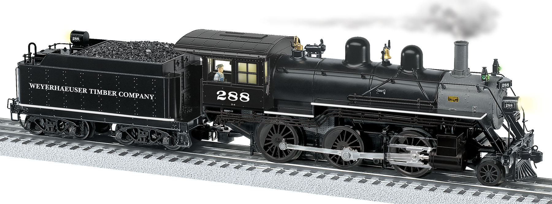 Weyerhaeuser Conventional Scale 2-6-0 Mogul Steam Locomotive #288 2-6-0 MOGUL STEAM LOCOMOTIVEAlthough the wheel arrangement was first developed in the mid-19th century, the 2-6-0 Mogul type ran on North American rails through the 1950s, hauling light passenger and freight consists and performing switching duties. Moguls were especially popular in branchline service where lighter rail and tight clearances restricted the use of larger, more “modern” motive power. Operated using nothing more than your standard Lionel transformer, these scale-sized Lionel steamers can negotiate tight O-31 curves, making them versatile enough to handle just about any O gauge layout. Lighting RailSounds Smoke Unit Wireless Tether SKU: 6-11291 Dimensions: Length: 16” Gauge: Standard O Scale price: 549.99 year: 2011 rail line: Weyerhaeuser Minimum Radius: O-31 Catalog Year: 2013 Catalog Title: Lionel 2013 Signature Edition Road Number: 288 2-6-0 Mogul Steam Locomotive - 10/11 Mogul 2-6-0 Conventional Product Video Transformer controlled forward, neutral, and reverse operation Synchronized fan-driven smoke unit Conventional <b>RailSounds</b> sound system Realistic separately applied coal load Powerful maintenance-free motor with momentum flywheel Die-cast metal locomotive body, frame, and pilot Magnetic coupler on rear of tender Traction tires Select separately applied details Die-cast metal tender body and trucks Opening tender water hatch for easy access to sound controls Operating headlight <b>Wireless Tether</b> connection between locomotive and tender Engineer figure Manuals Find the latest manuals in our support section. Replacement Parts Buy any replacement parts in our support section. Contact Contact a service station to fix your product