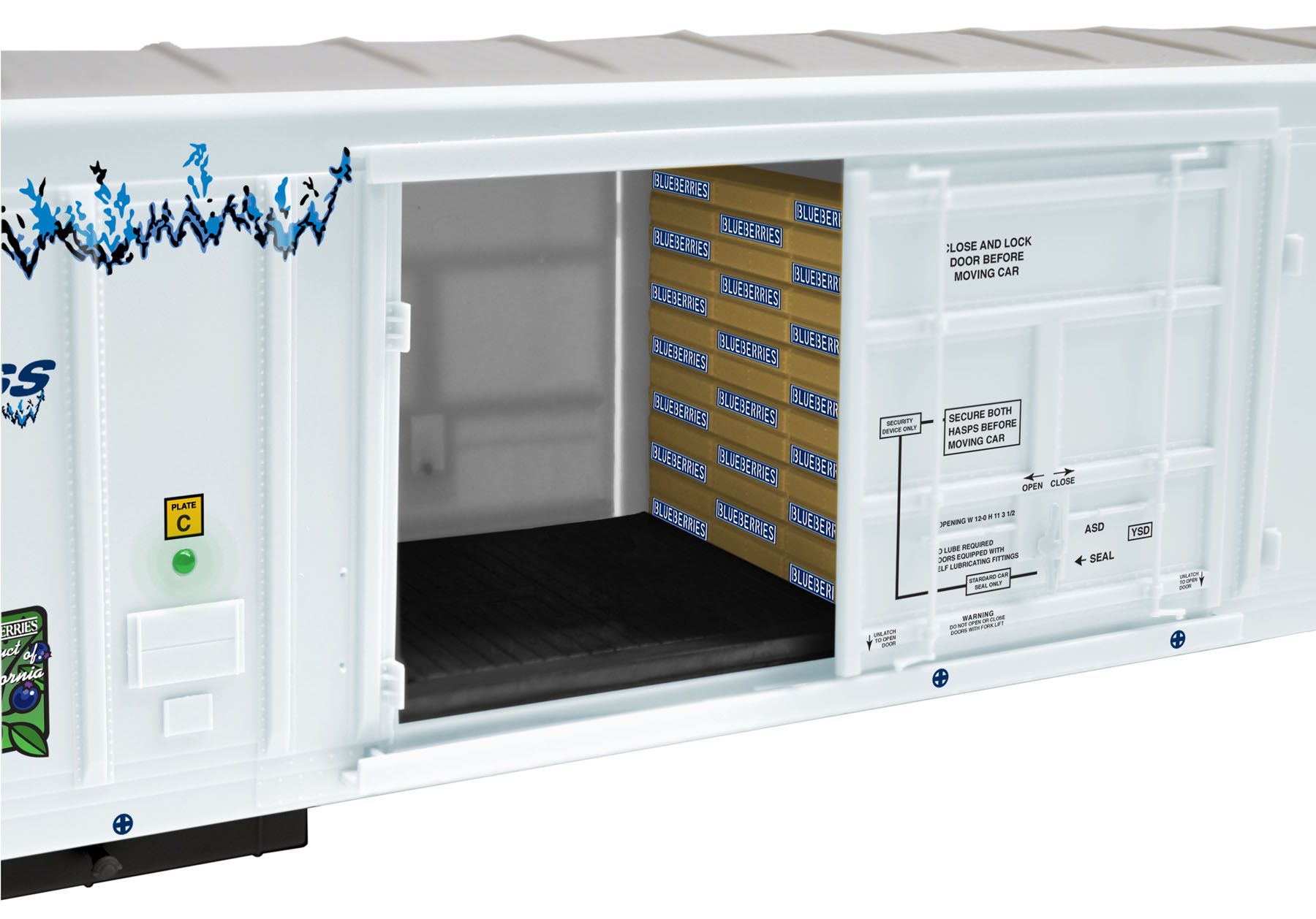 Inside each of the high gloss, pearl white reefers you’ll find something new. From one car you’ll hear the mechanical sounds of the cooling generator, while a second operating reefer fills with “icy cold smoke”. The third reefer comes packed with special box loads. Each of these 57’ refrigerator cars also come equipped with a green“check light” near the door to show that refrigeration is in operation and ready to roll.