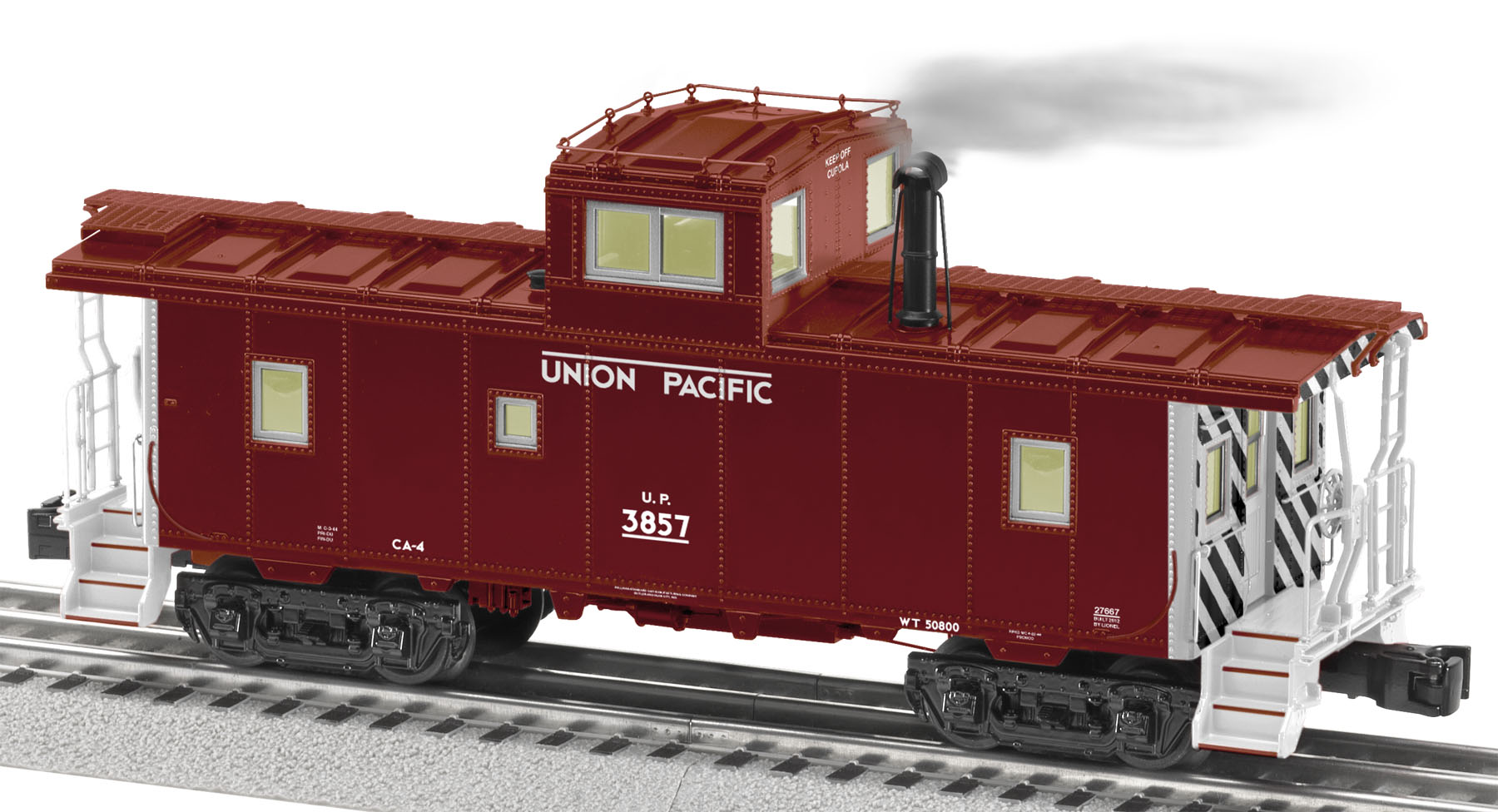 Union Pacific Ca-4 Caboose #3857 Ca CLASS CABOOSE Lighting Smoke Unit SKU: 6-27667 Dimensions: Length: 10” Gauge: Standard O Scale price: 94.99 year: 0 rail line: Union Pacific Minimum Radius: O-31 Catalog Year: 2013 Catalog Title: Lionel 2013 Signature Edition Road Number: None Die-cast metal trucks Hidden uncoupling tabs Separately applied metal underframe details Smoke unit with On/Off switch Detailed and painted interior with figures Interior illumination Manuals Find the latest manuals in our support section. Replacement Parts Buy any replacement parts in our support section. Contact Contact a service station to fix your product
